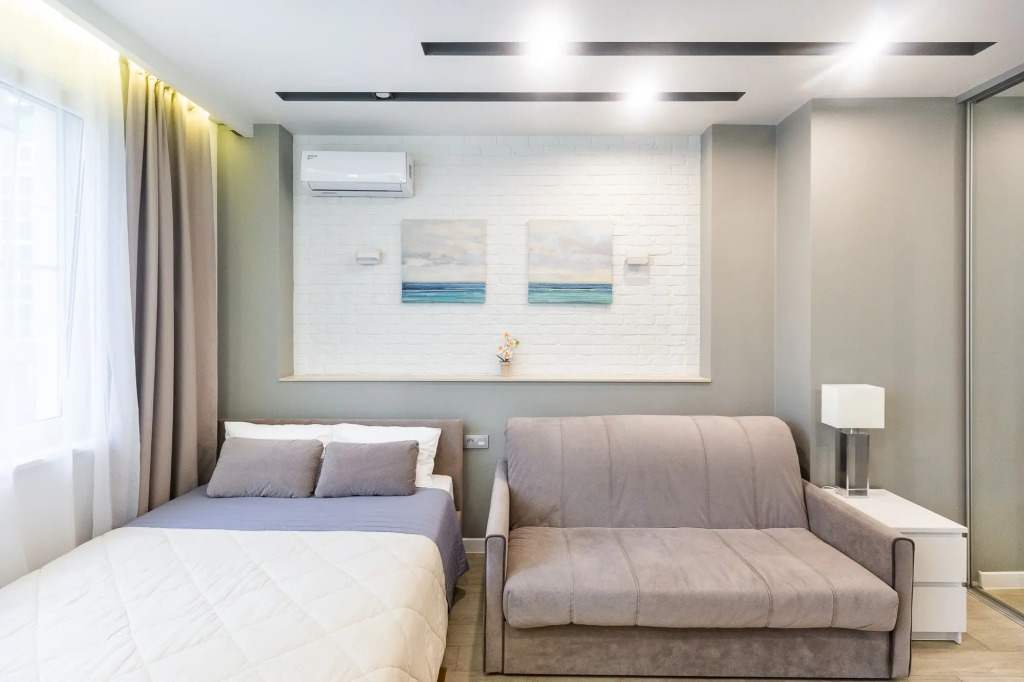Апартаменты представляют собой студию и подходят для размещения 3 гостей. Гостям предоставляются: двуспальный диван и кресло. При необходимости можно организовать дополнительное спальное место.
