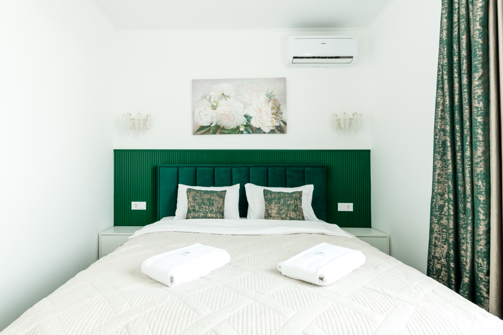 Также в распоряжении гостей: мини-холодильник, сейф, кондиционер, Smart-TV, Wi-Fi, утюг, гладильная доска, сушилка, фен, постельное бельё и полотенца (хлопок, 2 комплекта), белые халаты и средства для умывания в диспенсерах.