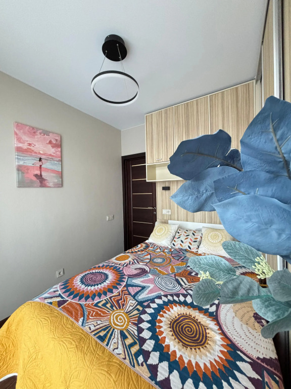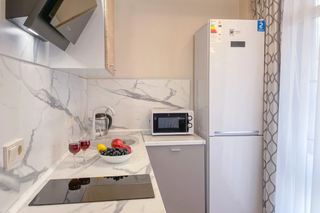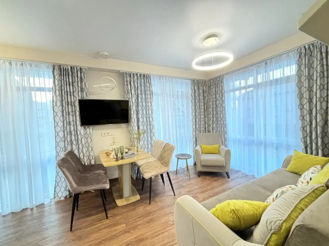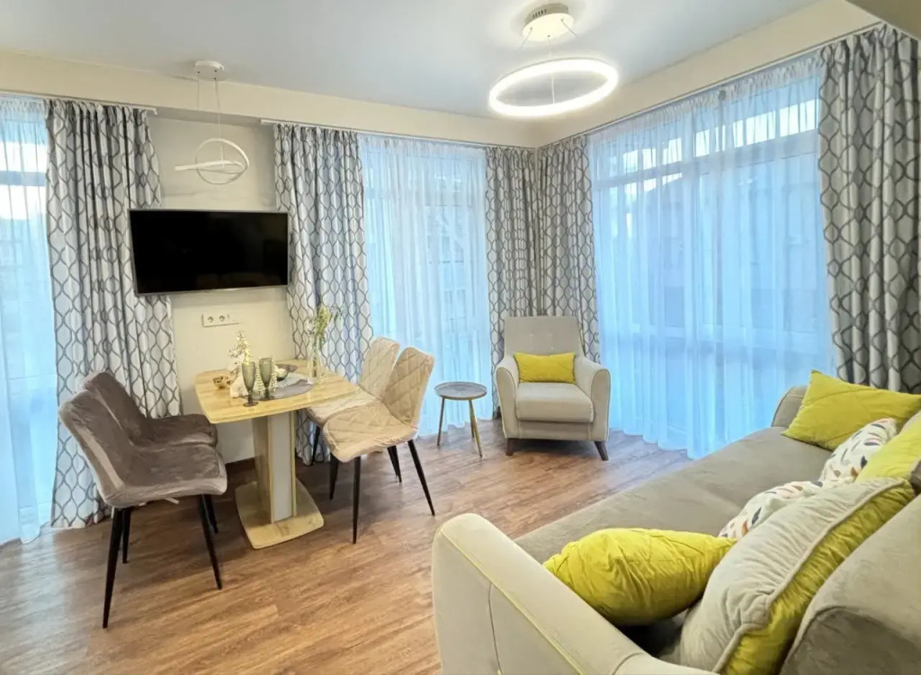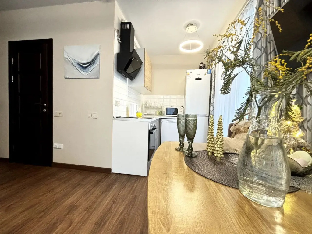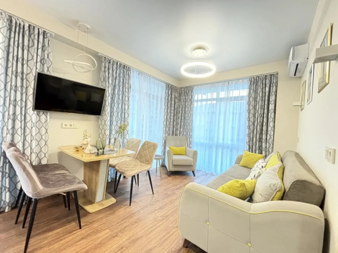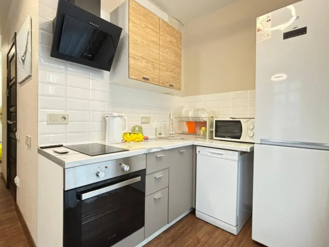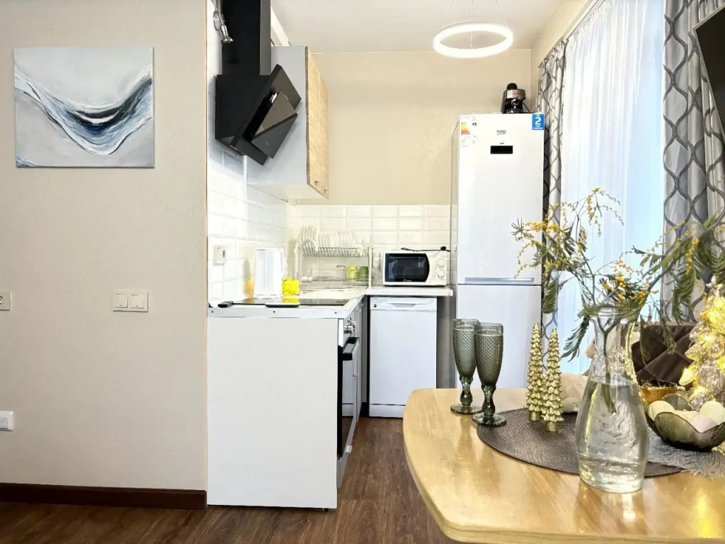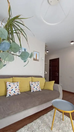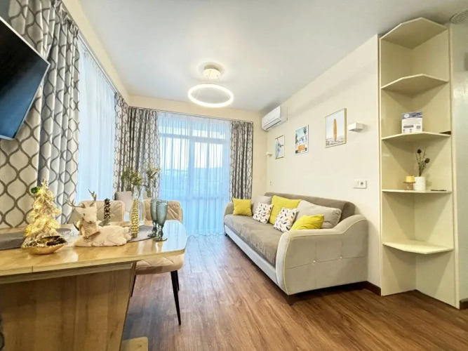На закрытой территории двора есть огороженная детская площадка и парковка. Под депозит выдаётся пульт от шлагбаума. Апартаменты находятся в доме бизнес-класса. В апартаментах раздельные комнаты: спальня и гостиная, объединённая с кухней. Возможно размещение 5 гостей: в спальне — двуспальная кровать с ортопедическом матрасом 30 см и топпером, в гостиной — двуспальный диван и кресло-кровать. Гостям могут предоставить детскую кроватку для ребёнка или раскладную кровать для шестого гостя. Оборудованы тёплые полы, есть 2 сплит-системы, Wi-Fi, посудомоечная машина, духовой шкаф, ванна, кофеварка, стиральная машина с сушкой.