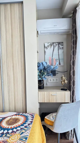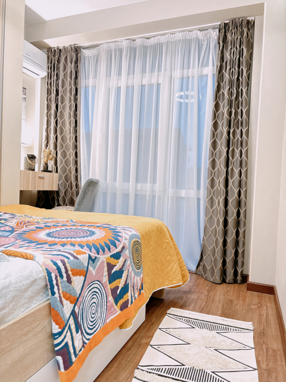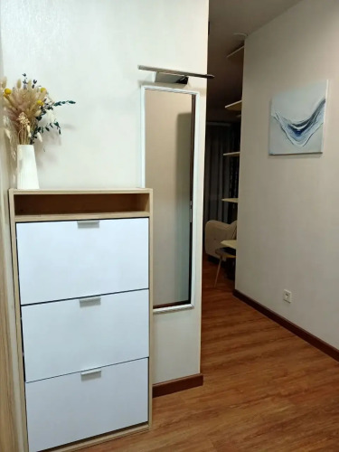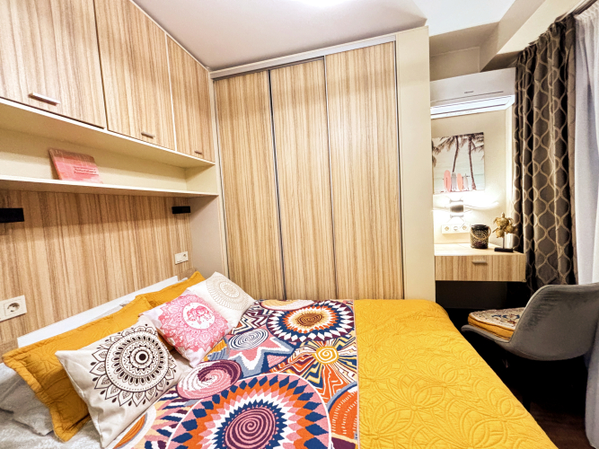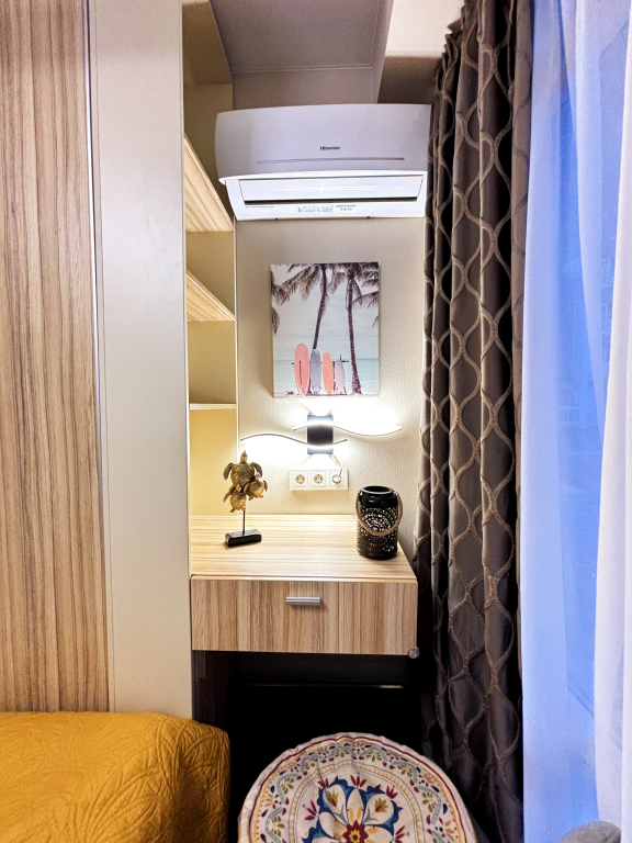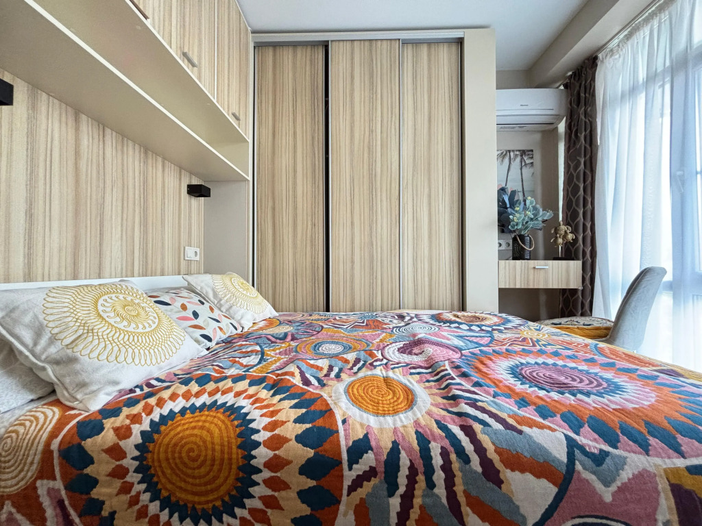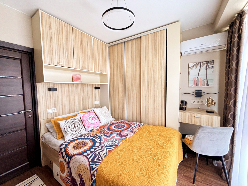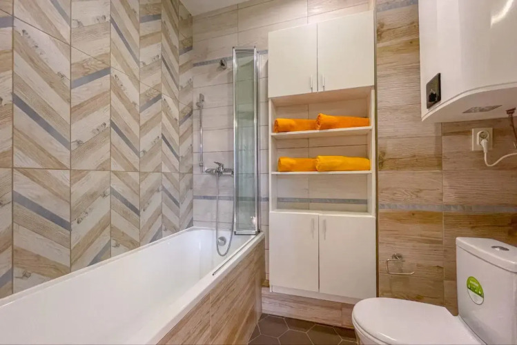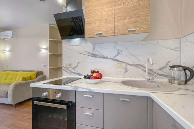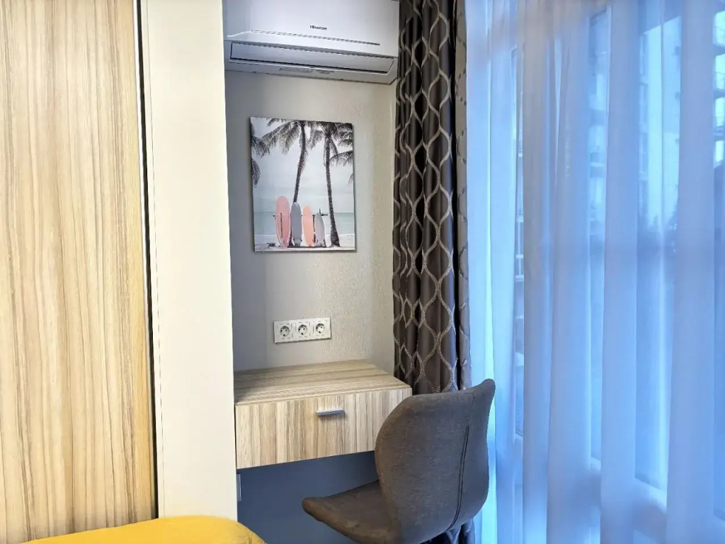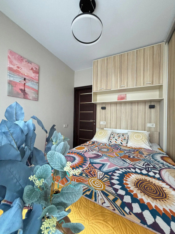На закрытой территории двора есть огороженная детская площадка и парковка. Под депозит выдаётся пульт от шлагбаума. Апартаменты находятся в доме бизнес-класса. В апартаментах раздельные комнаты: спальня и гостиная, объединённая с кухней. Возможно размещение 5 гостей: в спальне — двуспальная кровать с ортопедическом матрасом 30 см и топпером, в гостиной — двуспальный диван и кресло-кровать. Гостям могут предоставить детскую кроватку для ребёнка или раскладную кровать для шестого гостя. Оборудованы тёплые полы, есть 2 сплит-системы, Wi-Fi, посудомоечная машина, духовой шкаф, ванна, кофеварка, стиральная машина с сушкой.