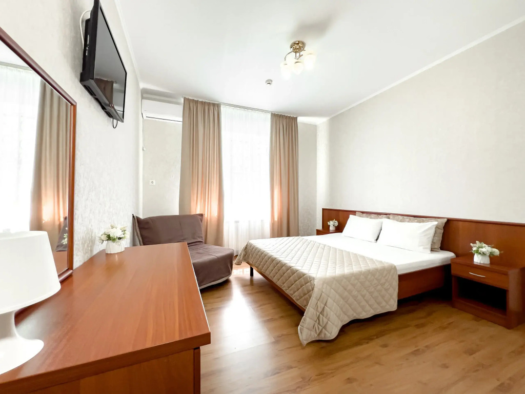 В номере вы найдёте телевизор. Оснащение зависит от выбранной категории номера.
