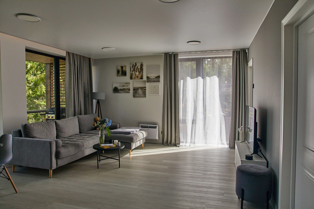 Гостевой дом оборудован умными технологиями, и подходит как для краткосрочного, так и для длительного проживания. Имеется необходимая бытовая техника, рабочие зоны, системы хранения.