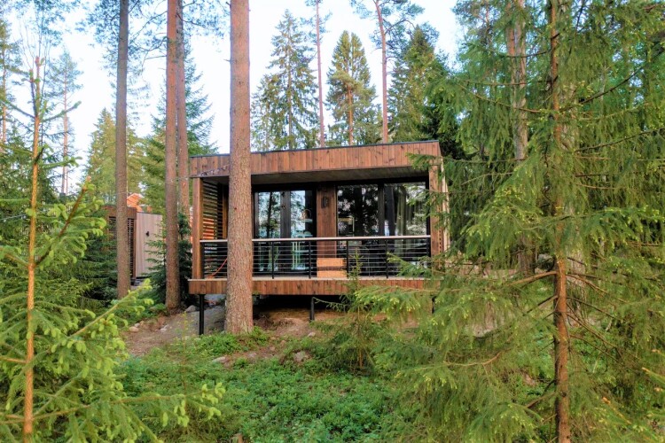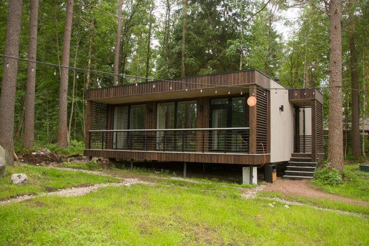 Спальные места оснащены ортопедическими матрасами, плотными шторами. Из окон открывается панорамный вид на лес. К услугам гостей элементы умного дома: электронный кодовый замок на входе, «Яндекс.Станция» с Алисой, датчики протечек и дыма. Есть доступ к скоростной сети Wi-Fi. Из развлечений для гостей есть Smart TV, PlayStation, настольные игры.