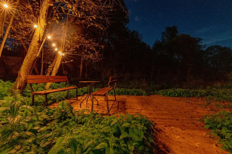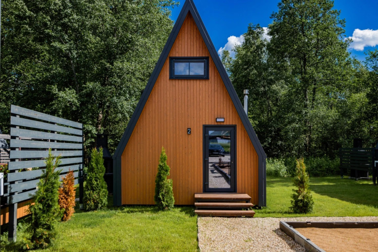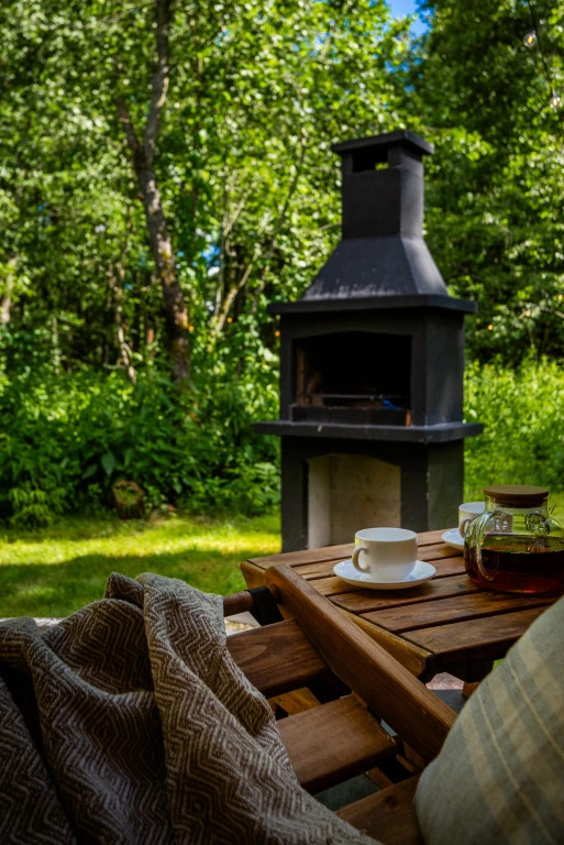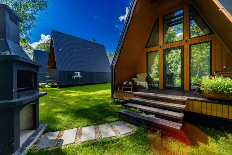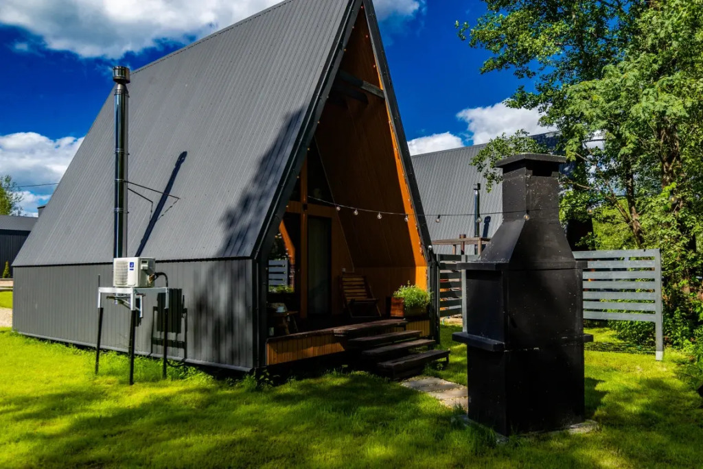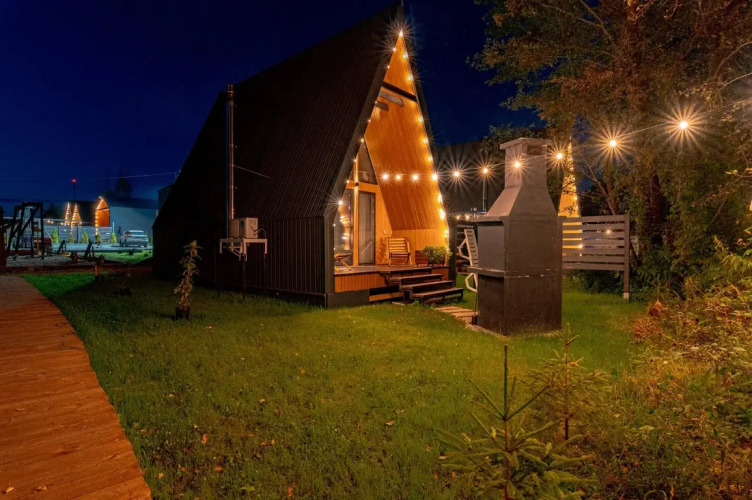 Имеет 2 этажа, рассчитан максимально на 4 человека, есть терраса с мебелью, зона отдыха и барбекю с решёткой и дровами.
