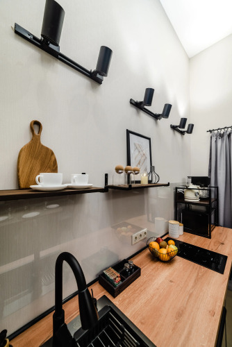 На первом этаже расположены гостиная с диваном и телевизором, кухонная зона с гарнитуром и обеденным столом, санузел и ванная комната с душевой кабиной и баней на дровах. В кухне — плита, холодильник с морозильником, посудомоечная машина, микроволновая печь, чайник, кофемашина и набор продуктов: соль, перец, сахар, чай, кофе, подсолнечное масло. Для приготовления и приёма пищи предоставляется посуда, кастрюли, сковорода, приборы, бокалы, кружки, салатники. В доме — тёплые полы.