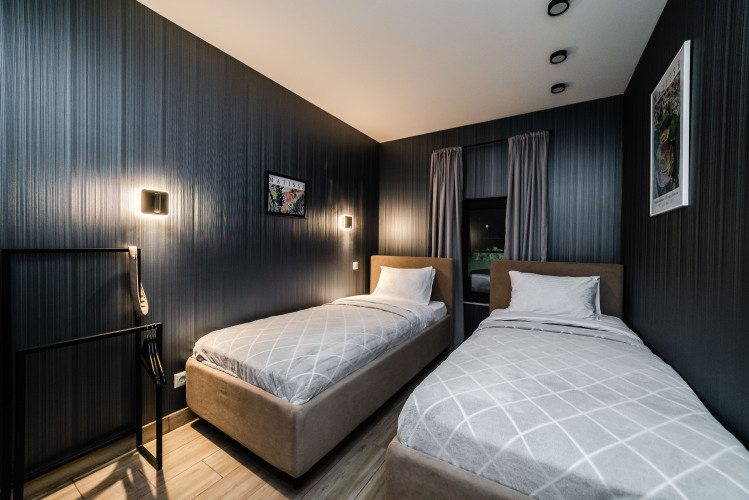На первом этаже — две спальни: одна с двуспальной кроватью, другая — с двумя односпальными кроватями.
