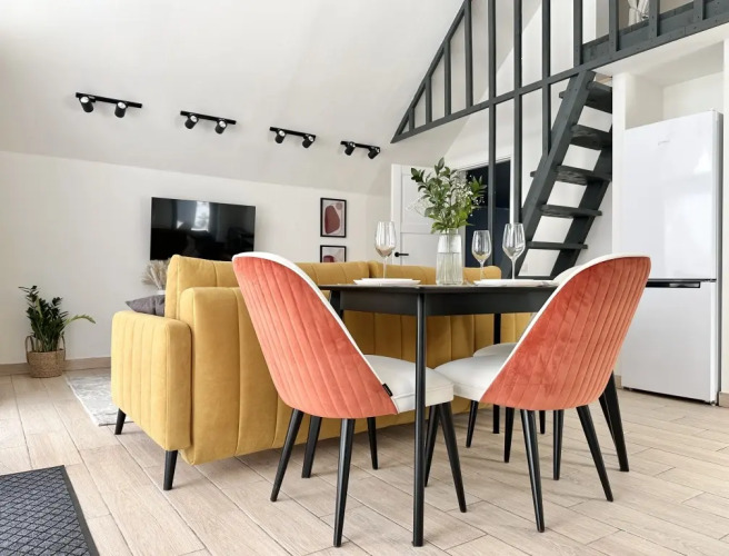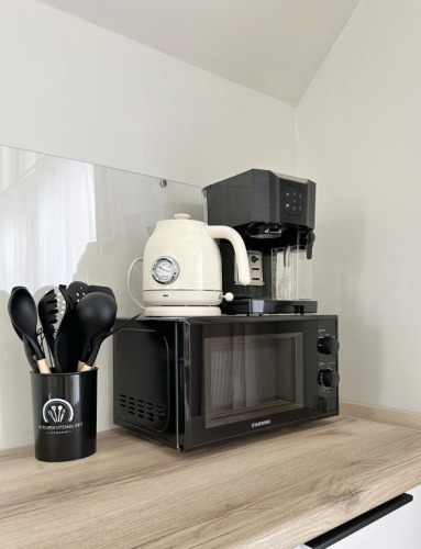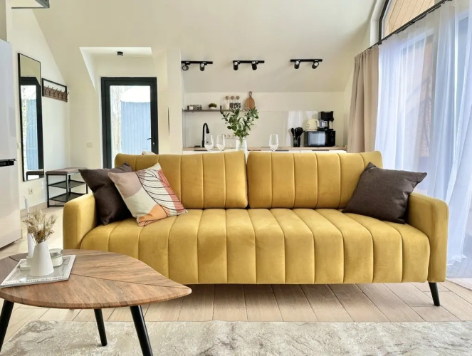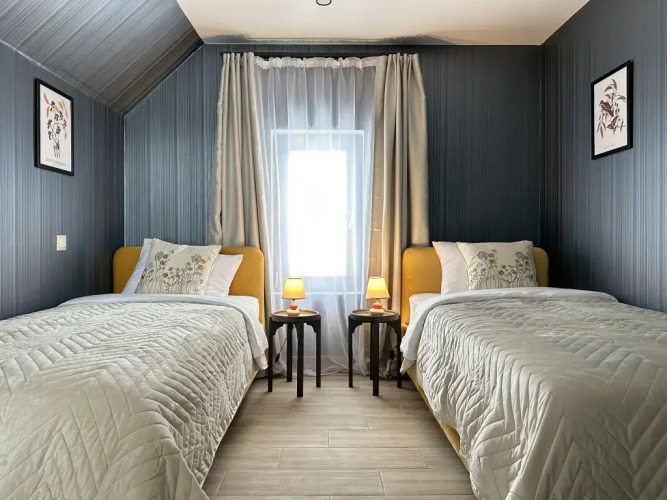 На первом этаже располагается просторная гостиная с диваном, телевизором, кухонная зона оборудована современным кухонным гарнитуром и обеденным столом. В кухне есть: плита, холодильник с морозильником, посудомоечная машина, микроволновка, чайник, кофемашина. Также на первом этаже есть санузел и современная ванная комната с душевой кабиной и инфракрасной сауной, которая доступна гостям бесплатно, банный чан оплачивается дополнительно. На первом этаже также есть спальня с двумя односпальными кроватями, на втором этаже расположена вторая спальня с двуспальной кроватью. В доме установлены тёплые полы. Имеется набор продуктов: соль, перец, сахар, чай, кофе, подсолнечное масло. Также гостям предоставляются полотенца, постельное бельё, гель для душа, мыло, шампунь, фен. Столовая посуда: тарелки, салатники, сковорода, кастрюли, приборы, бокалы, кружки. Для маленького гостя имеется детская кровать-манеж и стульчик для кормления. На территории работает Wi-Fi.