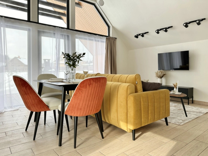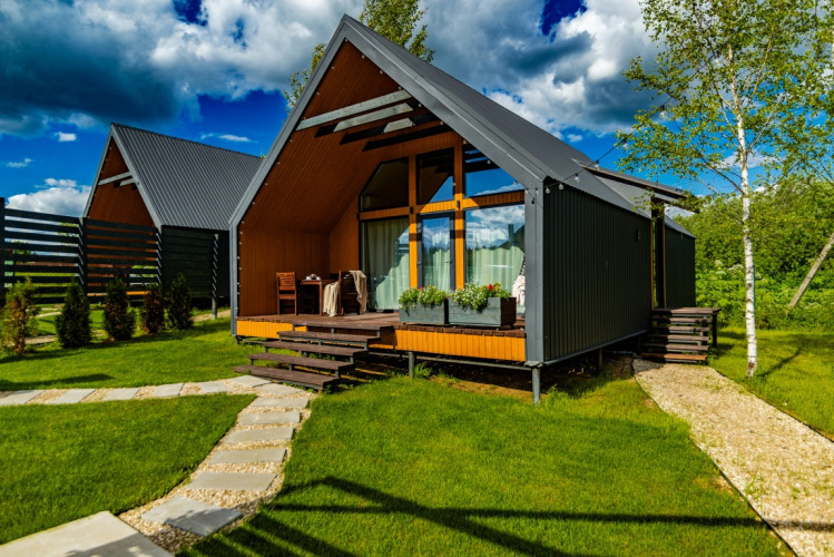 Площадь дома 85 кв. м., дом имеет 2 этажа, рассчитан максимально на 6 человек. Размещение: два двуспальных места и два односпальных. Есть просторная терраса с мебелью, зона отдыха и барбекю, в котором можно жарить мясо, рыбу, овощи даже в мороз. Решётка для барбекю и дрова предоставляются бесплатно. Уголь, берёзовые карандаши и розжиг можно приобрести за дополнительную плату.