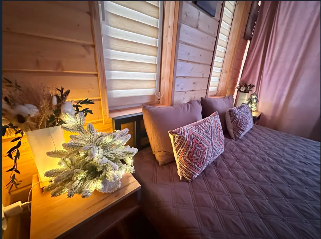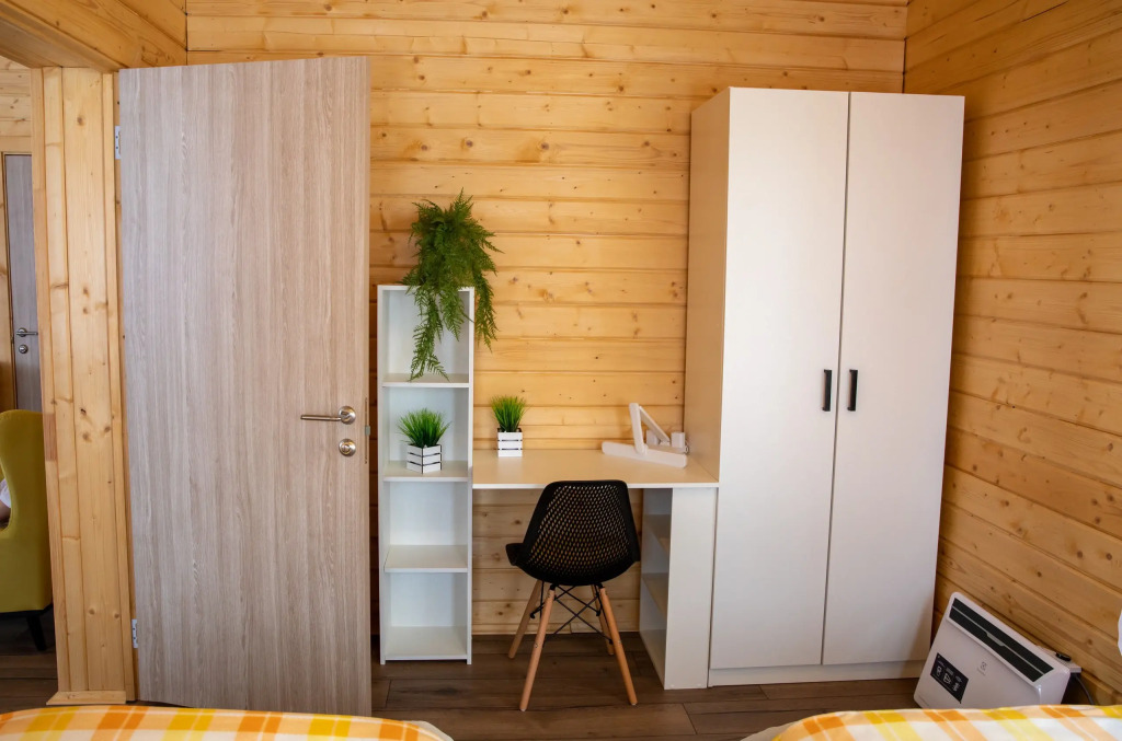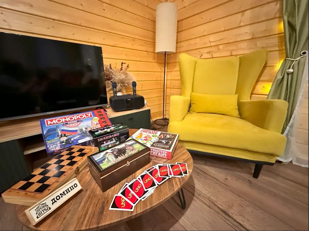 Также гостям предоставляют: постельное бельё из химчистки, тапочки и полотенца, средства гигиены. Отличительные черты этого домика: финская сауна, чан с подогревом, костровая чаша, настольные игры, караоке, кофемашина, батут для детей.