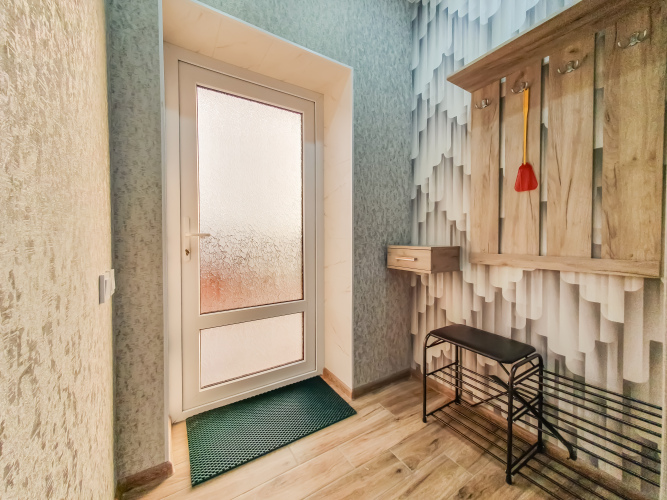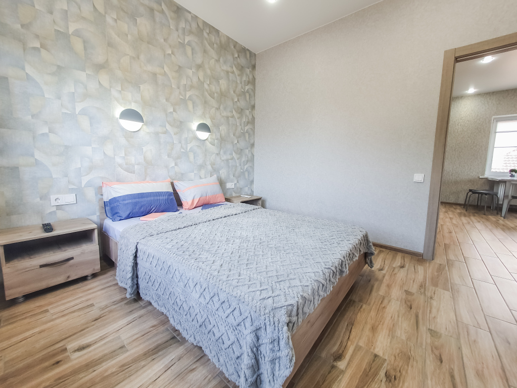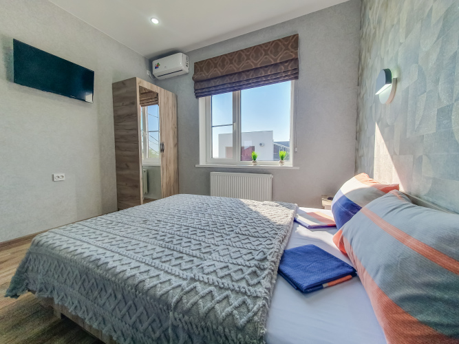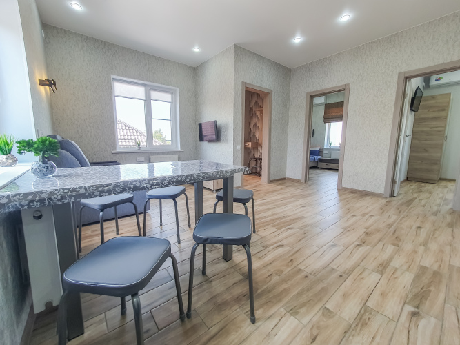 В распоряжении гостей: две отдельные изолированные комнаты, кухня-гостиная, санузел. Установлены двуспальная кровать, две односпальные кровати, а также диван. Сплит-система с функцией озонирования воздуха есть в каждой спальной комнате.