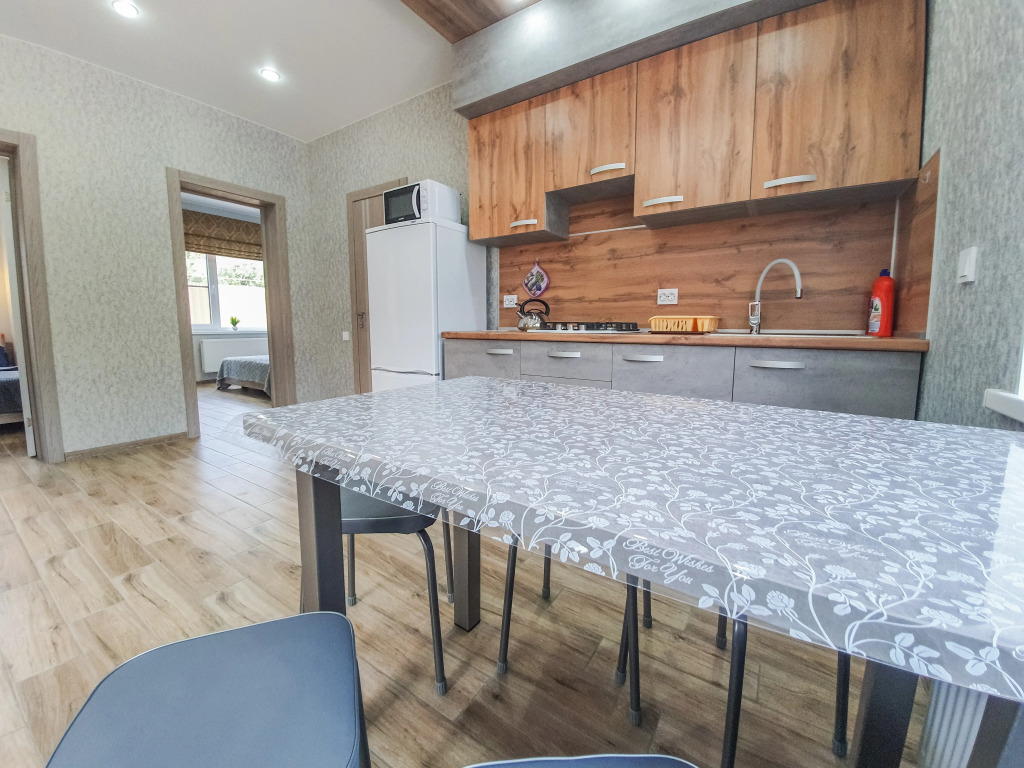 В распоряжении гостей: две отдельные изолированные комнаты, кухня-гостиная, санузел. Установлены двуспальная кровать, две односпальные кровати, а также диван. Сплит-система с функцией озонирования воздуха есть в каждой спальной комнате.
