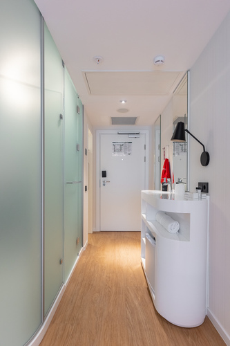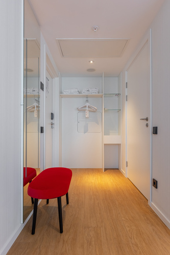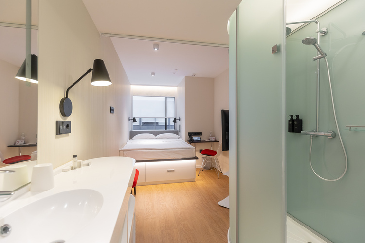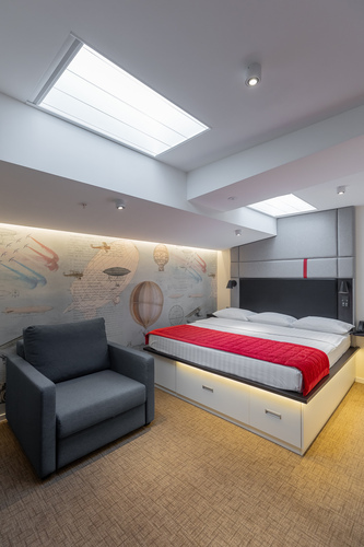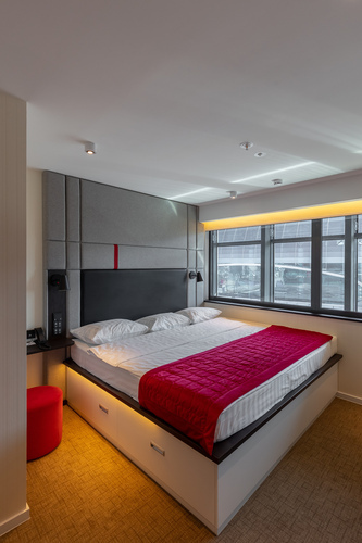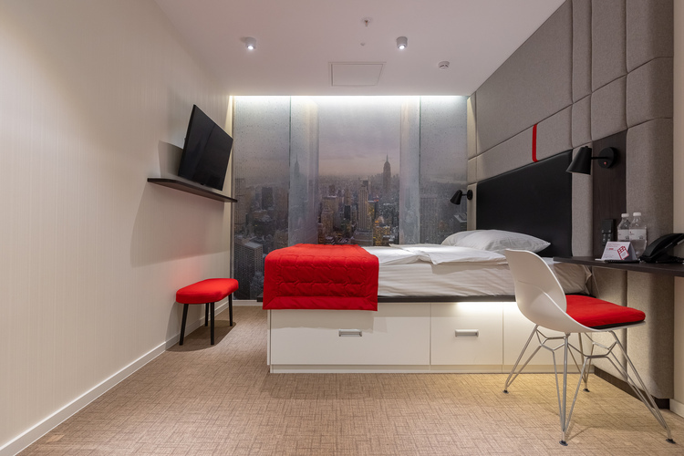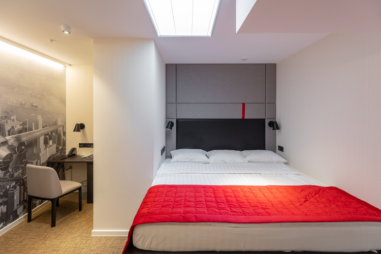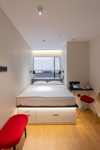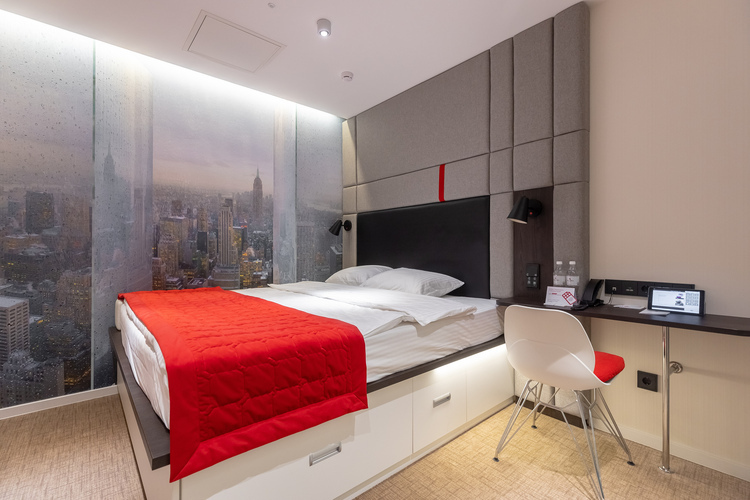 Смарт-номер площадью 15 кв. м. Комната хорошо освещенная, в светлой цветовой гамме. При необходимости можно создать полную темноту даже днем – благодаря шторам blackout. Для комфортного сна установлена кровать King-size 200*200 см. В номере все продумано так, чтобы путешественнику было удобно: есть небольшое рабочее место, мини-бар, сейф, кондиционер, мультимедийная система (ТВ, музыкальный контент), телевизор LCD 43'' ULTRA HD и телефон. Бесплатный высокоскоростной WI-FI.