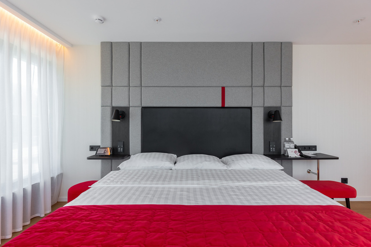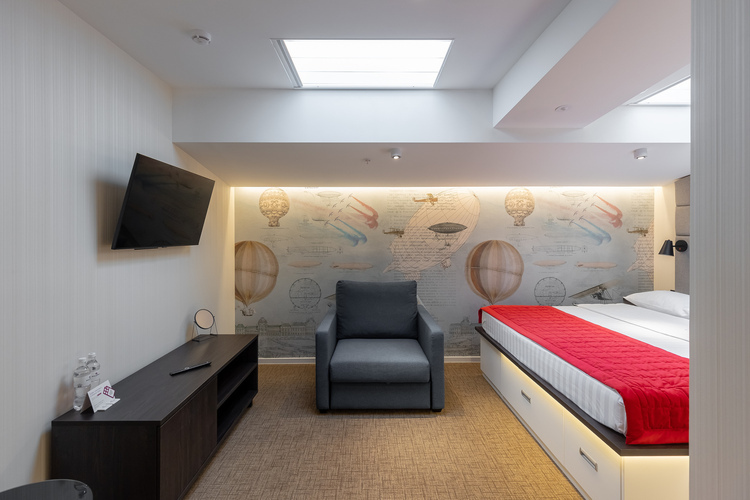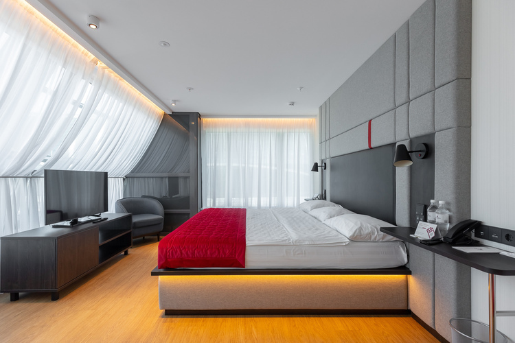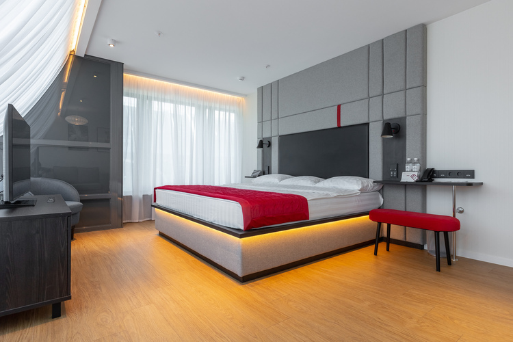 Просторный номер площадью 25 кв. м. Оформлен в нейтральных светлых оттенках с добавлением ярких акцентов. В центре номера – кровать королевских размеров, King-size 200*200 см. Для комфортного отдыха в дневное время предусмотрены плотные шторы Blackout, абсолютно не пропускающие дневной свет. Для удобства гостей в номере – мини-бар, сейф, кондиционер, телевизор LCD 43'' ULRA HD и мультимедийная система (ТВ, музыкальный контент). Бесплатный высокоскоростной WI-FI.