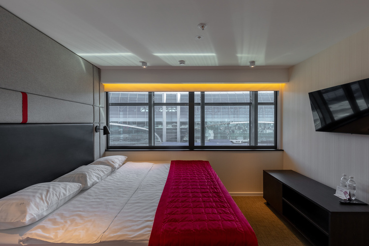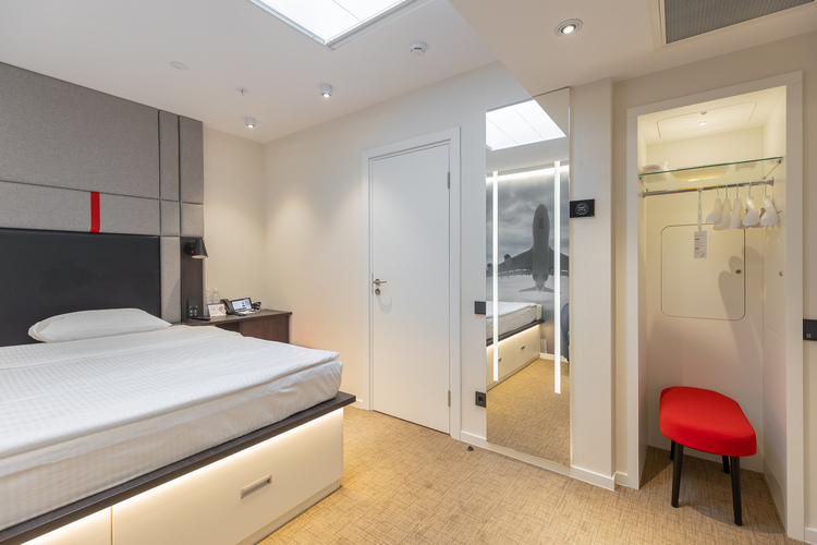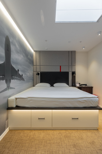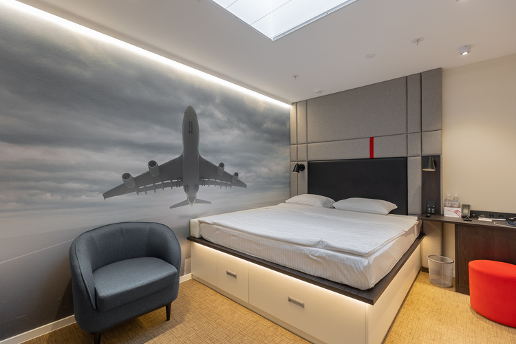 Современный номер площадью 14 кв. м, оформленный в спокойных сдержанных оттенках. С помощью SMART планшета регулируется освещение, микроклимат, расположение штор, мультимедиа (ТВ, музыкальный контент). Удобная кровать для комфортного сна до перелета или после – 140*200 см. Приятную расслабленную атмосферу помогут создать шторы blackout с высокой степенью плотности – это надежная защита от дневного света. Кондиционер, сейф, телефон. Бесплатный высокоскоростной WI-FI