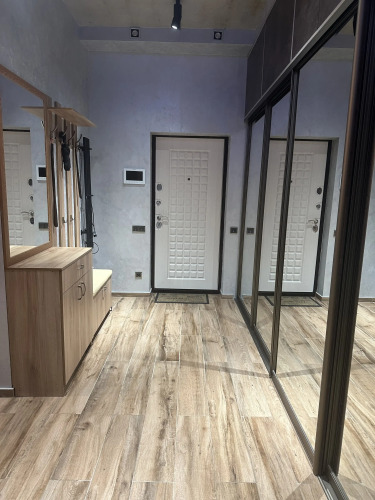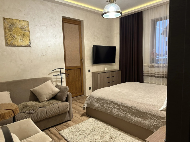 Апартаменты с интерьером в стиле «Лофт» расположены на первом этаже. Имеется открытый балкон со шкафом с 5 местами для горнолыжного оборудования. Максимальное размещение составляет 4 гостя взрослых, а также 2 детей до 14 лет. На территории доступны: двуспальная кровать размером 180х200 и диван раскладывающийся 160 см, 2 смарт-телевизора и комод для вещей, раскладывающийся диван размером 200х200, журнальный стол-трансформер, который раскрывается в обеденный стол, укомплектованная кухня, плита электрическая на 4 конфорки, микроволновая печь, электрический чайник, электрокофеварка, встроенный холодильник с морозильной камерой, посуда, разнообразные бокалы, кружки, приборы и другая кухонная утварь, душевая кабина, раковина, биде, зеркало, фен, полотенца, косметика и туалетные принадлежности, высокоскоростной Wi-Fi и интернет-телевидение, кондиционер, гладильная доска и утюг, а также сушилка для одежды, шкаф-купе для хранения одежды. По всему дому сделан тёплый пол. Имеются различные световые точки, камин и ковёр-шкура испанской коровы.