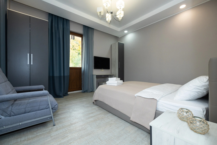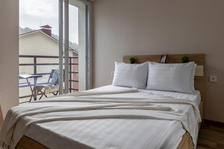 Апартаменты панорамой на горы. Открытый балкон. Спальня. Жить в Горах.