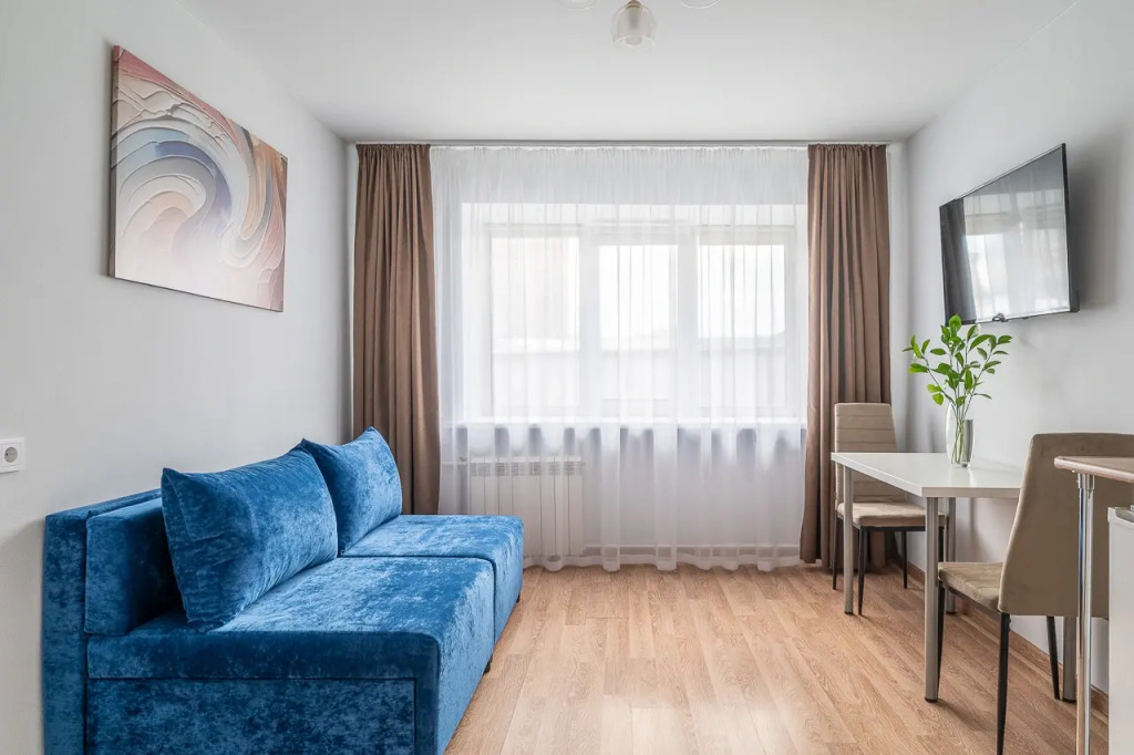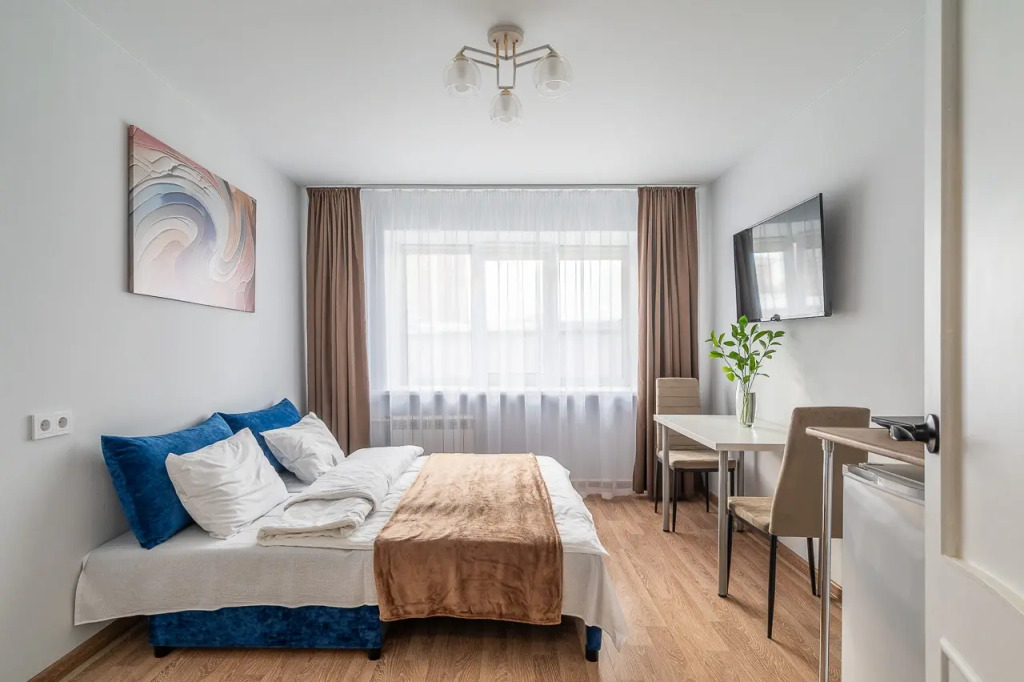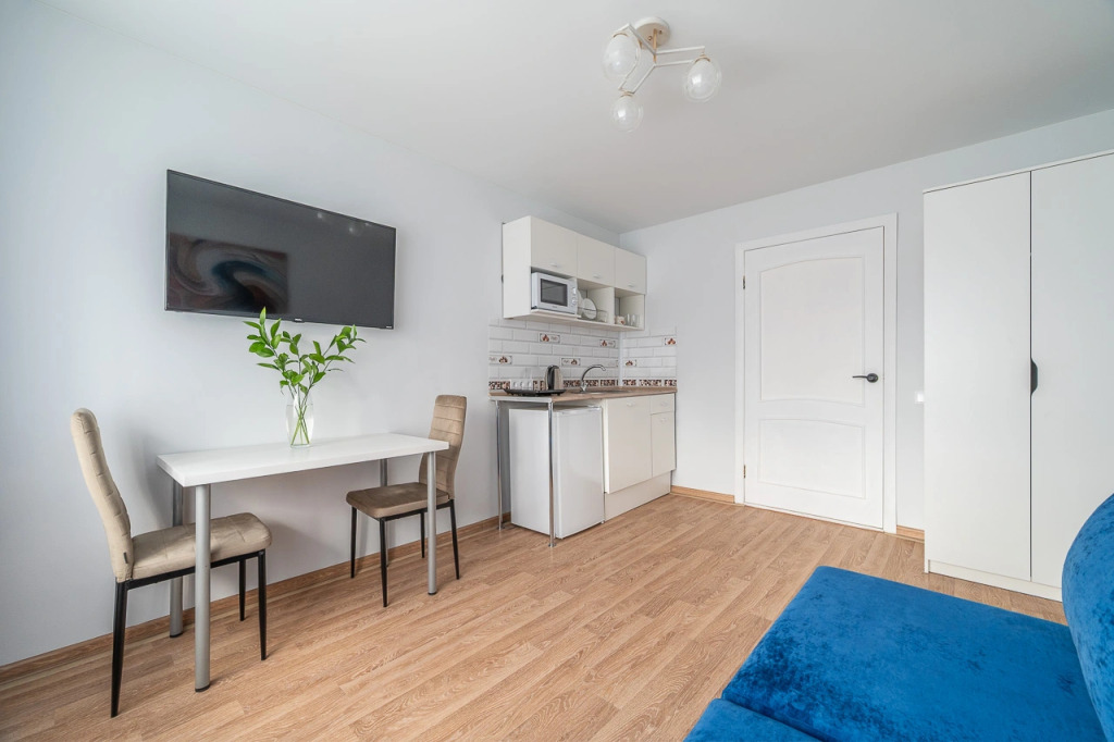 В студии есть: два кресла-кровати, которые можно использовать как раздельно, так и вместе. Получится два односпальных места или одно двуспальное место. Также в распоряжении гостей: постельное бельё, полотенца, безлимитный Wi-Fi.