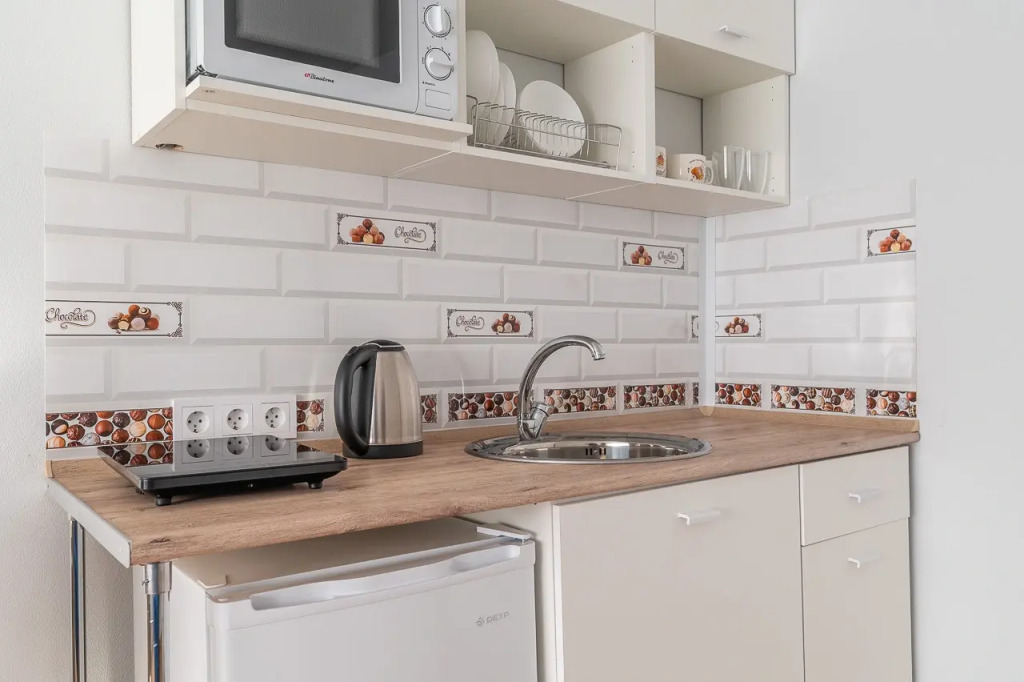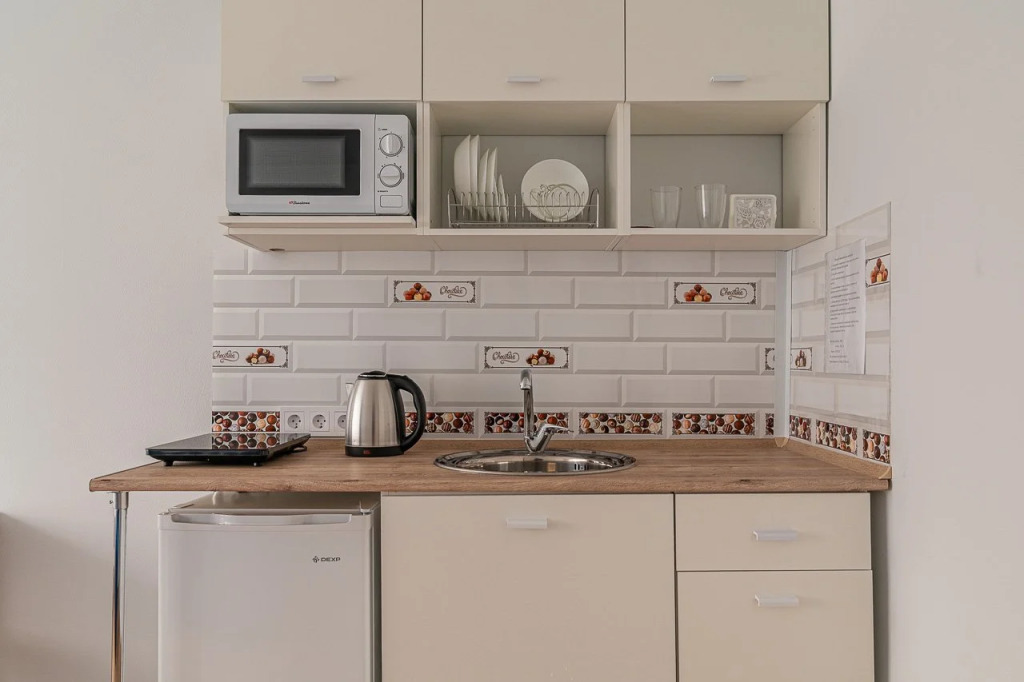 В каждой студии есть своя мини-кухня с раковиной, санузел общий для 3 студий.