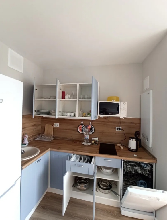 Кухня оборудована бытовой техникой, включая холодильник, варочную поверхность, посудомойку, микроволновку, чайник, капсульную кофеварку. Имеется посуда для приготовления и сервировки.