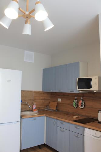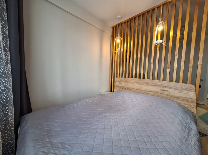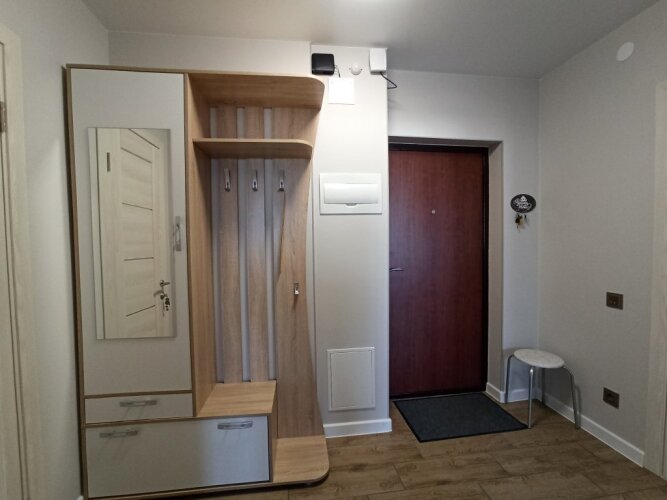Апартаменты площадью 42 кв.м подходят для размещения до 4-х гостей. В распоряжении гостей 1 двуспальная кровать, 1 двуспальный диван, шторы блэкаут, рабочее место, фен, утюг, гладильная доска, сушилка, бойлер, автономное отопление, телевизор с кабельными каналами. Также в апартаментах: бесплатный Wi-Fi, постельное бельё и полотенца.