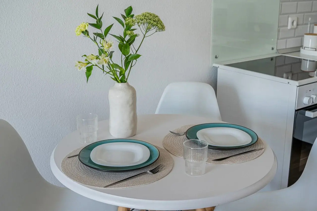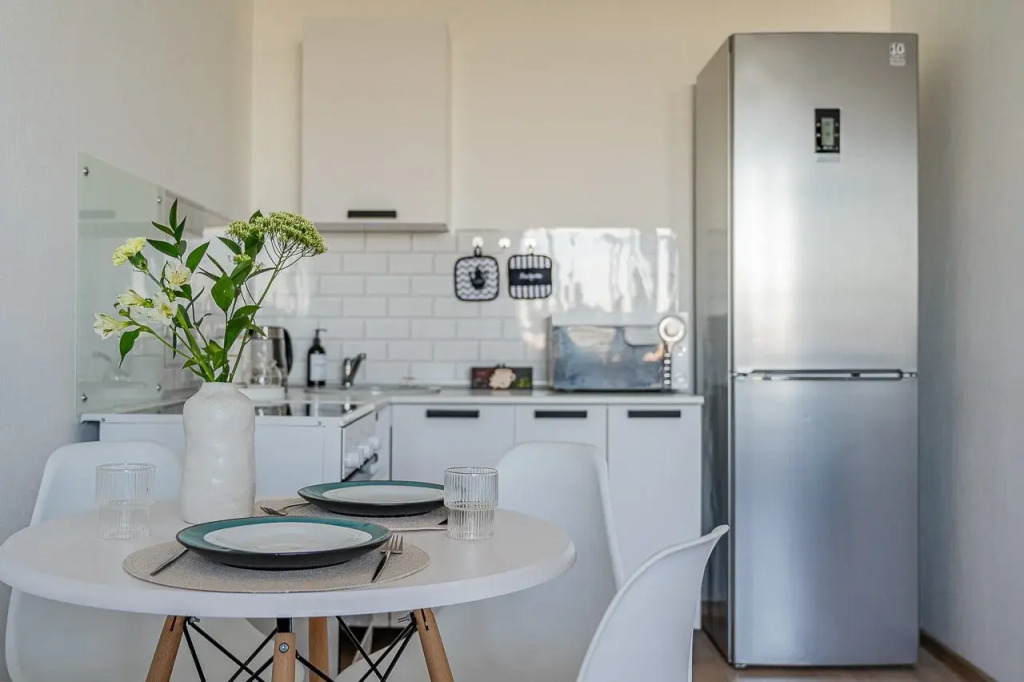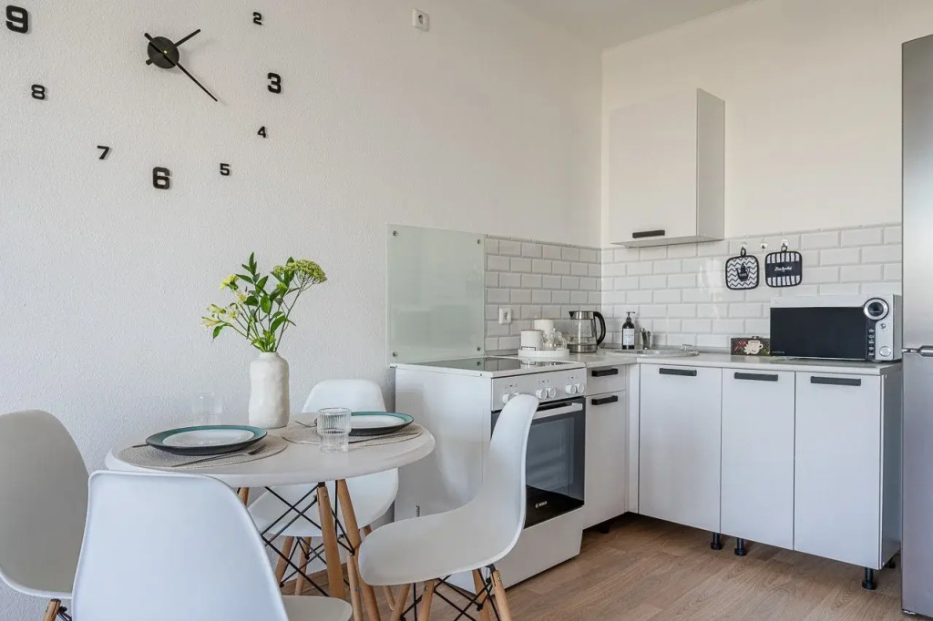 На кухне есть вся необходимая бытовая техника: холодильник, микроволновка, индукционная плита, чайник, посуда и столовые приборы, чай, кофе, сахар, каша в пакетиках.