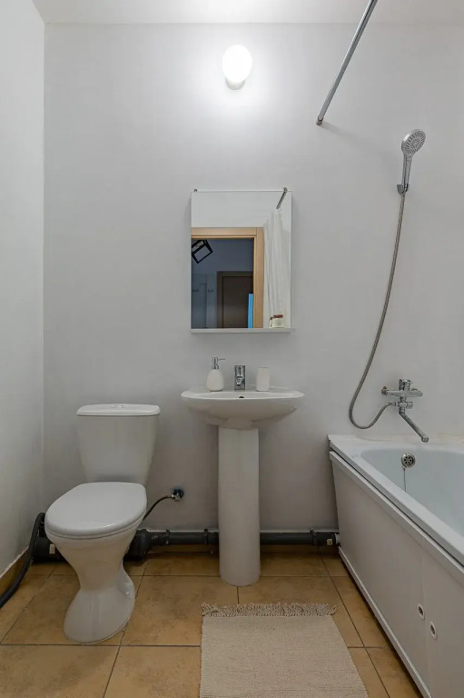 В ванной комнате: полноценная ванна, мягкие полотенца, фен, косметические принадлежности (мыло, шампунь, гель для душа, крем для рук, ватные палочки, ватные диски, патчи, предметы женской гигиены), стиральная машина и стиральный порошок.