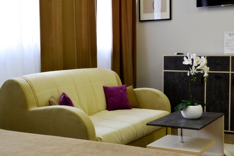 LUX PROMO (тариф *ДЕТИ БЕСПЛАТНО) - это семейный четырехместный номер площадью 30 м2 с двуспальной или двумя односпальными кроватями на выбор и раскладным диваном. В номере удобная мебель, кондиционер, телевизор, холодильник, душ в ванной комнате, фен, сейф и бесплатный Wi-Fi. Приветственный чай и кофе, бутилированная вода.