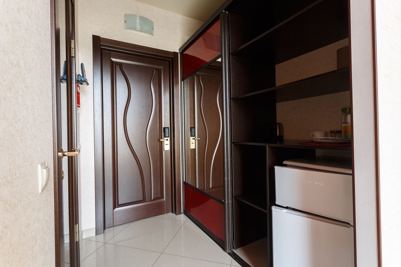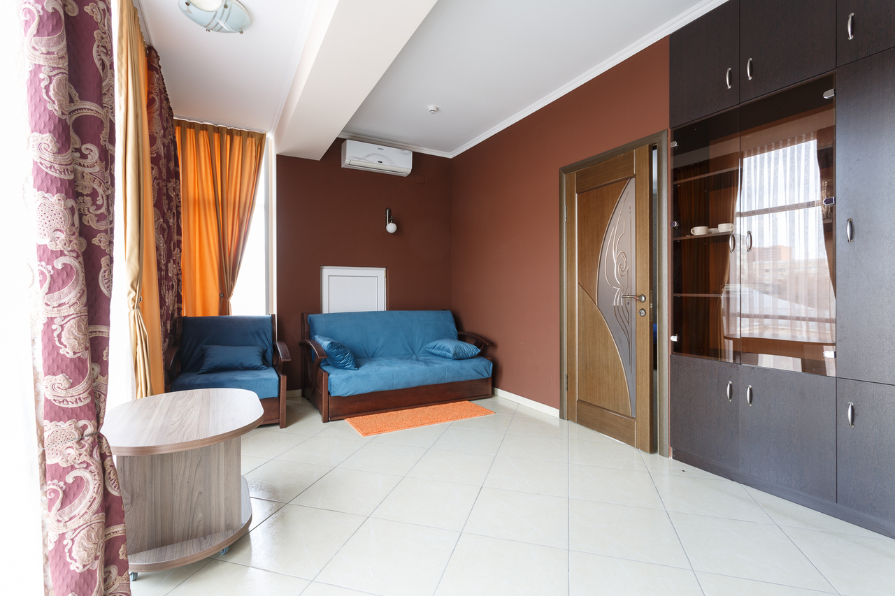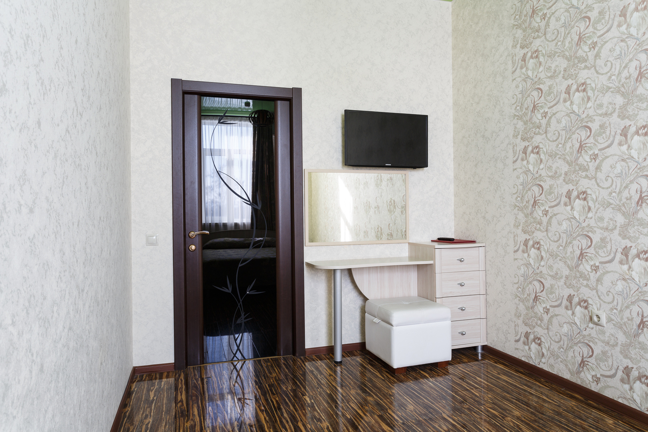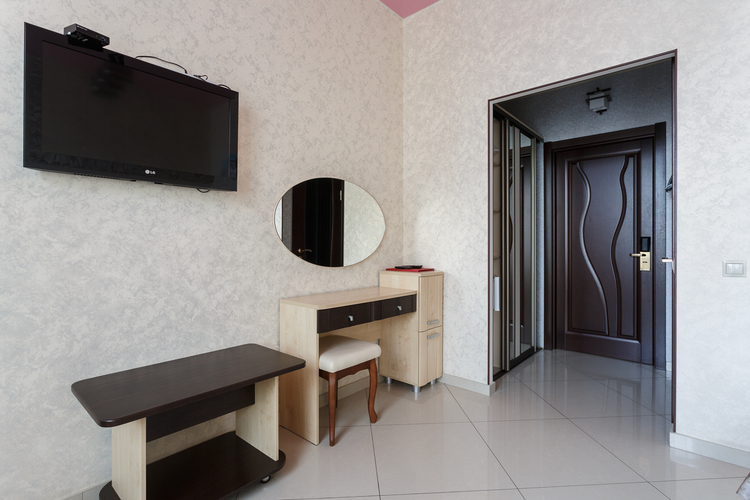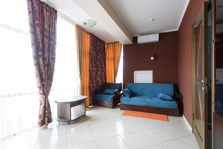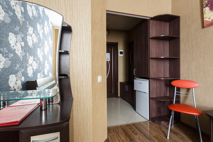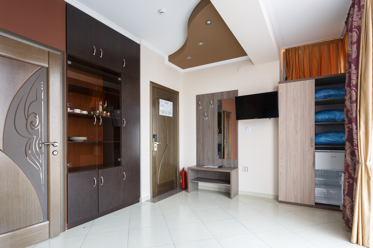 Площадь номера: 30 м2. В номере: две односпальные кровати или двуспальная кровать, стол, стулья, шкаф, диван, прикроватные тумбочки, туалетный столик, шкаф-купе, кондиционер, телефон, тумбочка, телевизор, посуда, микроволновая печь, кухонный гарнитур, чайник, холодильник, чай. В ванной: туалет, раковина, душ, душевая кабина, средства личной гигиены, тапочки, фен, набор полотенец.