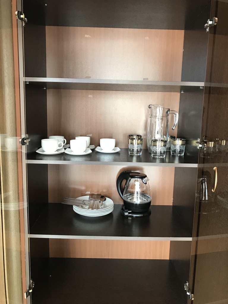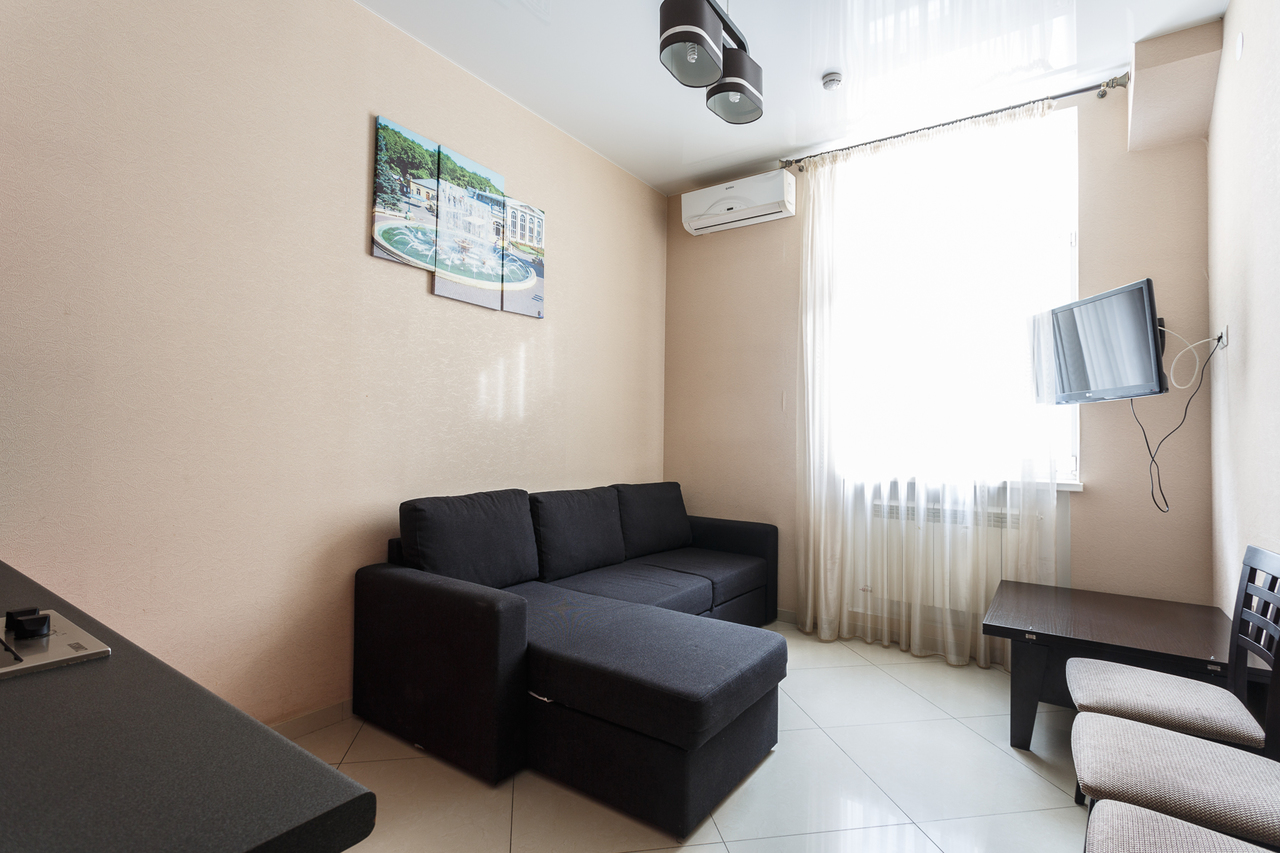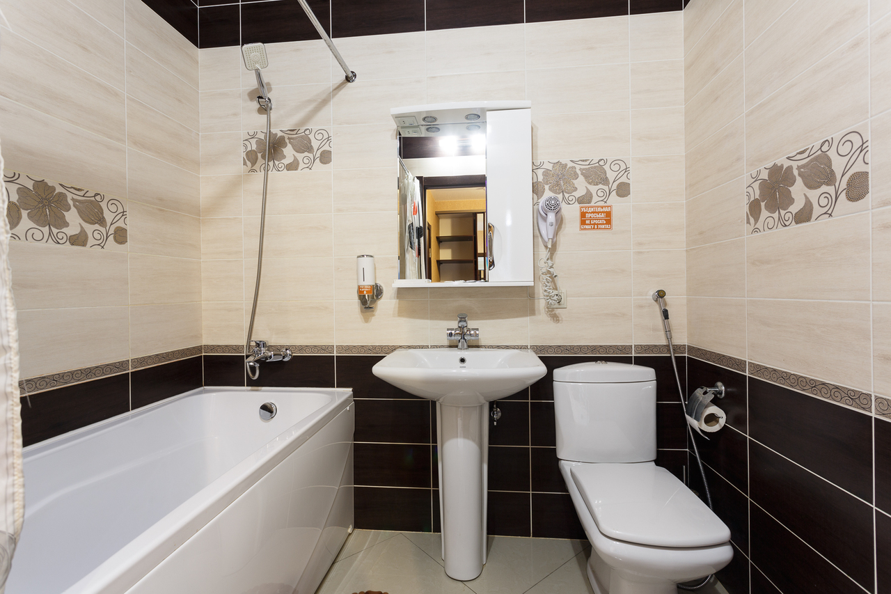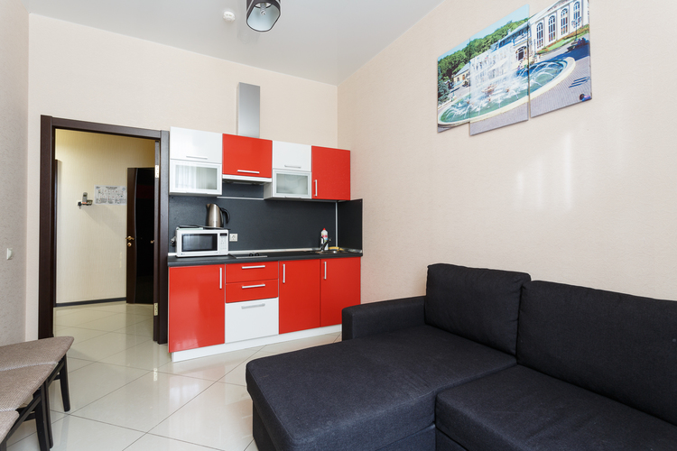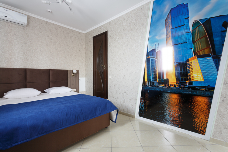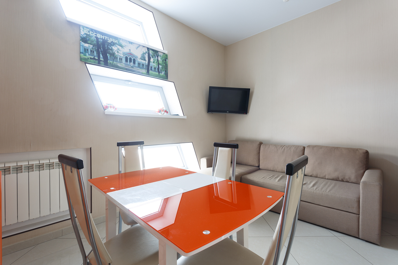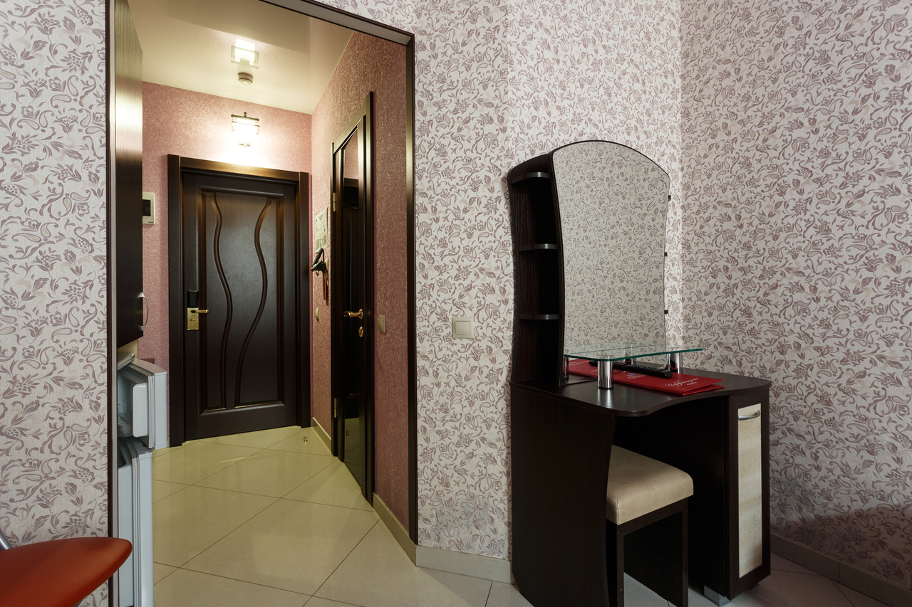 Площадь номера: 30 м2. В номере: две односпальные кровати или двуспальная кровать, стол, стулья, шкаф, диван, прикроватные тумбочки, туалетный столик, шкаф-купе, кондиционер, телефон, тумбочка, телевизор, посуда, микроволновая печь, кухонный гарнитур, чайник, холодильник, чай. В ванной: туалет, раковина, душ, душевая кабина, средства личной гигиены, тапочки, фен, набор полотенец.