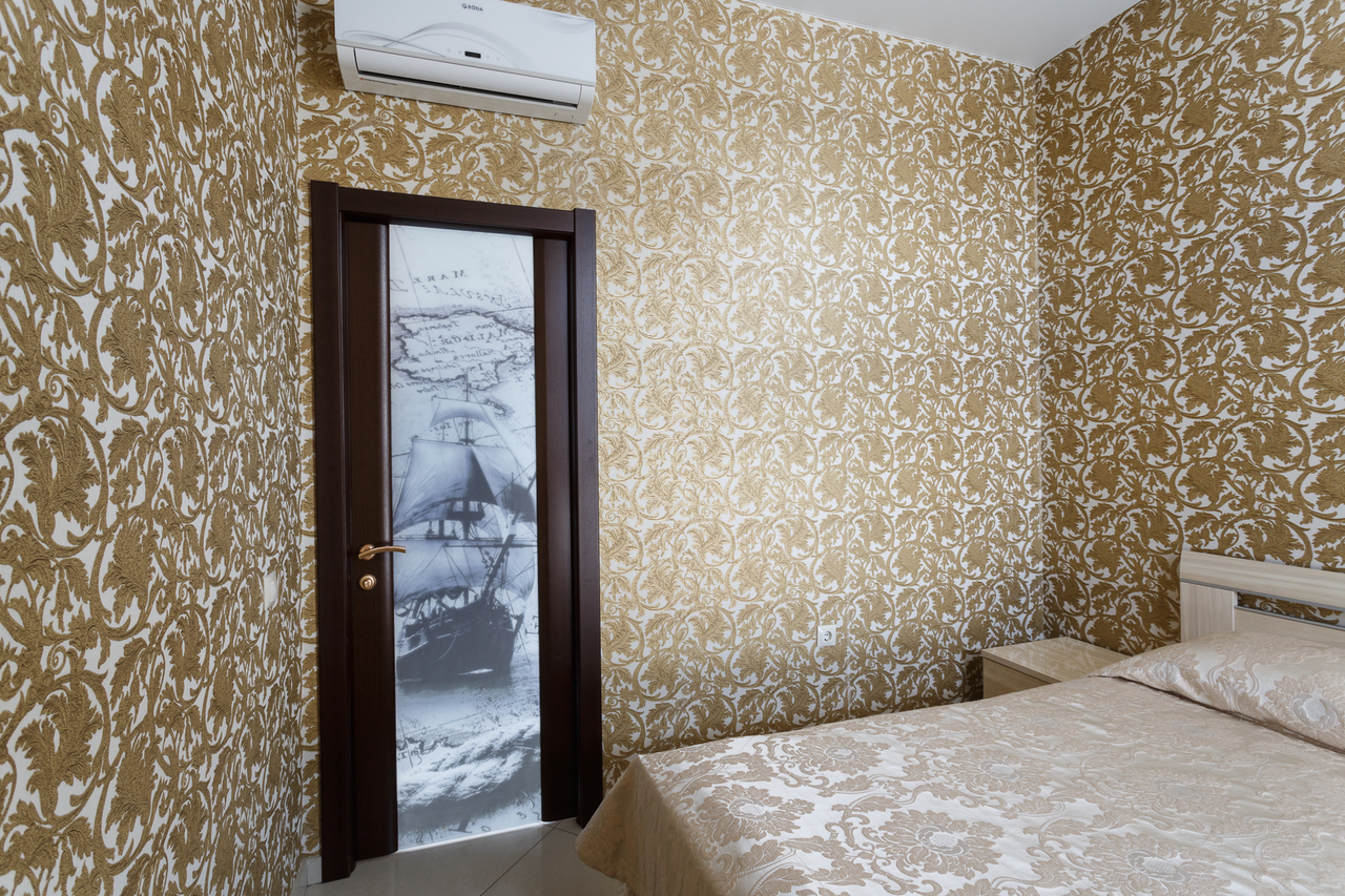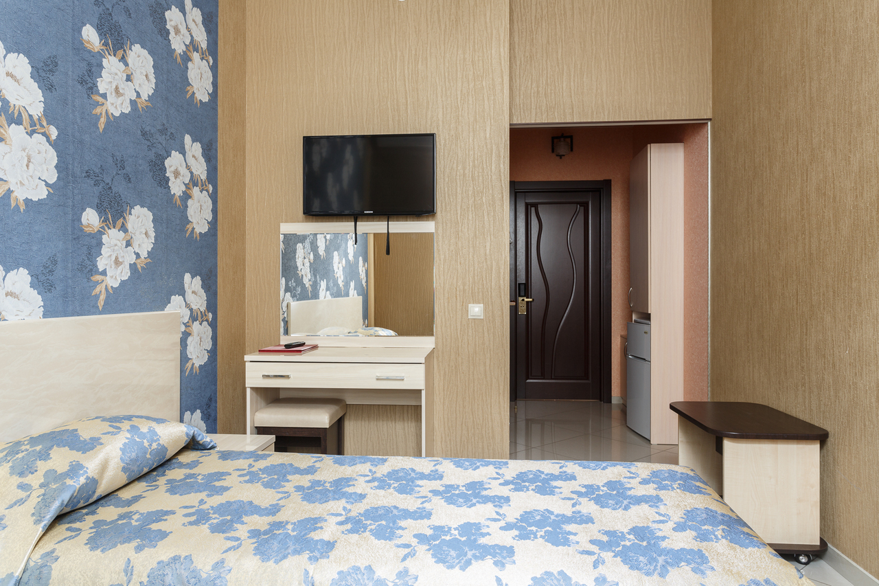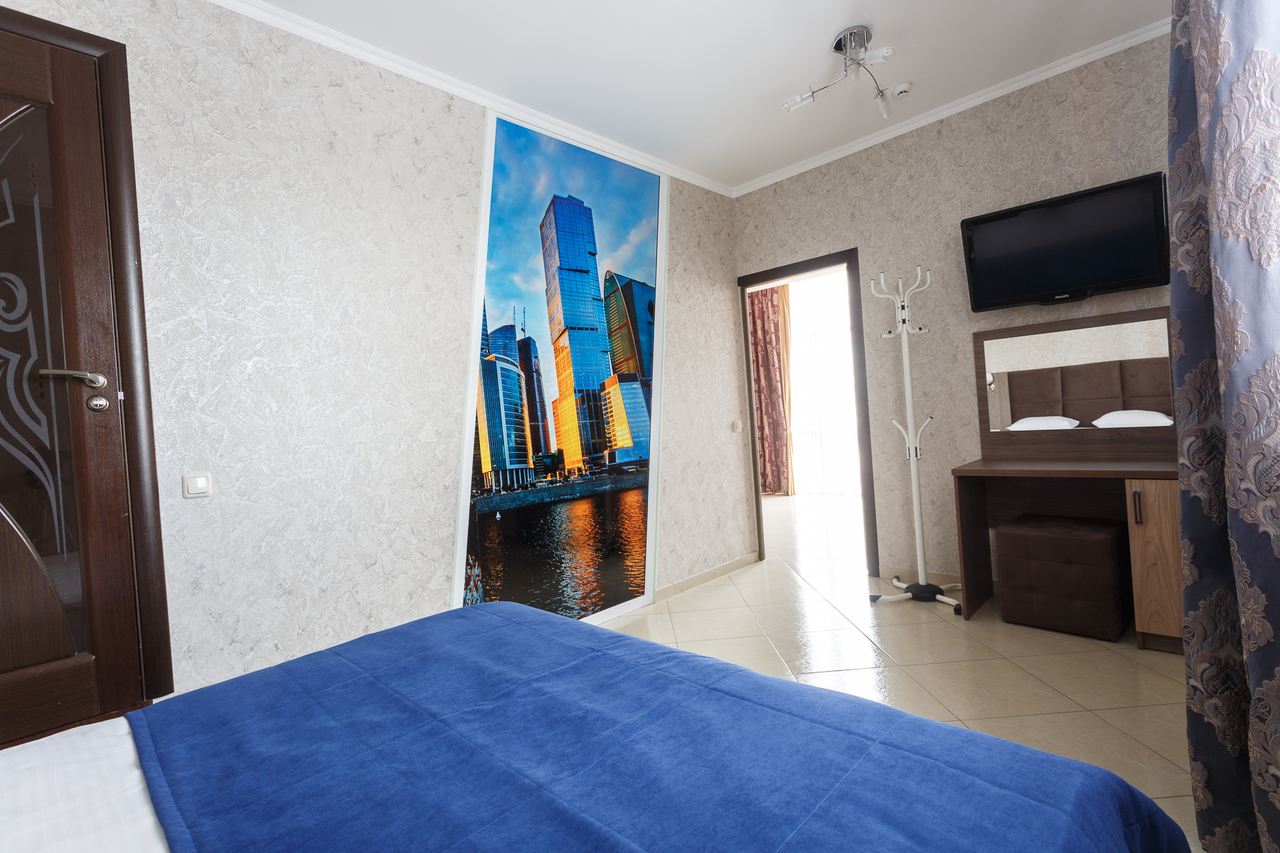 Площадь номера: 30 м2. В номере: двуспальная кровать и диван-кровать, стол, стулья, шкаф, диван, прикроватные тумбочки, туалетный столик, шкаф-купе, кондиционер, телефон, тумбочка, телевизор, посуда, микроволновая печь, кухонный гарнитур, чайник, холодильник, чай. В ванной: туалет, раковина, ванна, средства личной гигиены, тапочки, фен, набор полотенец.