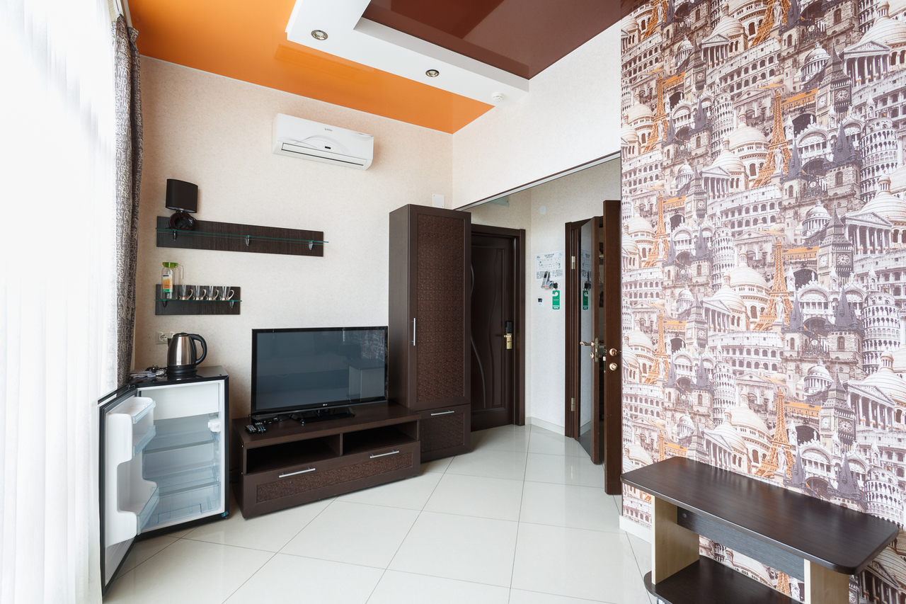 Площадь номера: 27 м2. В номере: односпальная кровать, стол, шкаф, диван, прикроватные тумбочки, кондиционер, телефон, тумбочка, журнальный столик, телевизор, посуда, холодильник. В ванной: туалет, раковина, душ, душевая кабина, средства личной гигиены, тапочки, фен, набор полотенец.