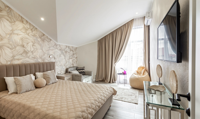 Номер уютно обставлен и оснащён необходимым, чтобы отдохнуть после долгого и насыщенного дня. Имеются телевизор. Оснащение зависит от выбранной категории номера.