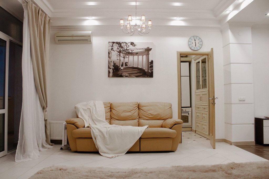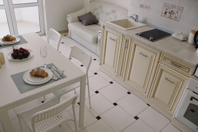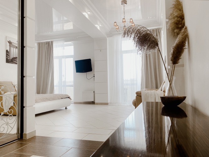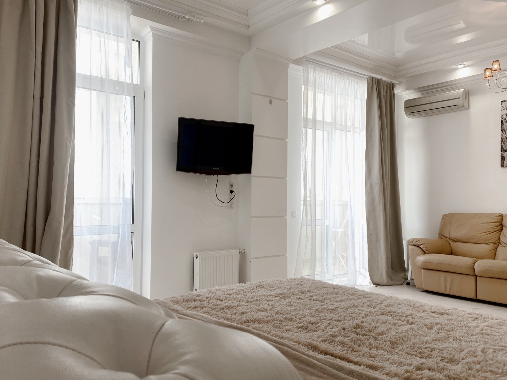 Апартаменты подойдут для отдыха пары или семьи с ребенком. В комнате — двуспальная кровать (190х200), диван, стол, шкаф-купе, телевизор. Предоставляются постельные принадлежности. Кухня оборудована бытовой техникой: плита, духовой шкаф, микроволновая печь, посудомоечная машина, чайник, тостер, посуда и столовые приборы. Раскладной диван на кухне может быть трансформирован в дополнительное спальное место. На кухне также есть телевизор. В санузле установлена ванная с душевой кабиной, бойлер и стиральная машина. На балконе вам будет приятно выпить кофе и насладиться захватывающим видом на море.