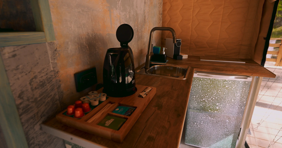 Гостям доступны номера категории «Лодж на холме» с двуспальной кроватью, мини-кухней, душем и санузлом, видом на озеро и лес, и «Терраса с двумя лоджами» с двуспальной кроватью, мини-кухней, душем и санузлом, расположенные на крыше ресторана, откуда открывается вид на озеро.