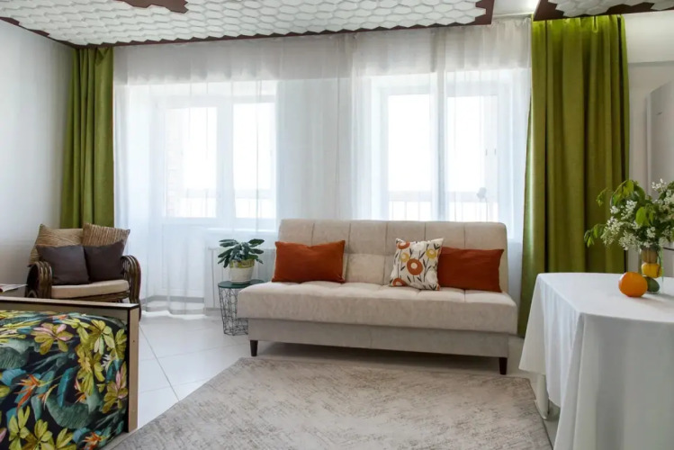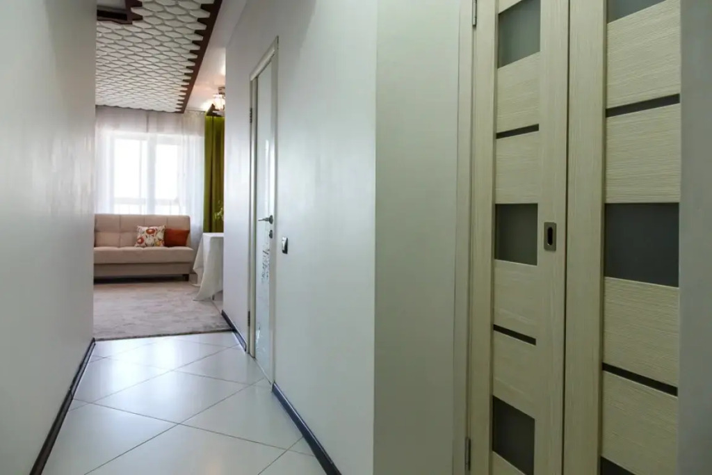 В подъезде находится 5 апартаментов, возможно размещение больших компаний на одной площадке. Внутри — двуспальная кровать и двуспальный раскладной диван с постельными принадлежностями и бельём. В распоряжении гостей — Smart-TV с высокоскоростным безлимитным интернетом, холодильник, плита, микроволновая печь, чайник и стиральная машина.