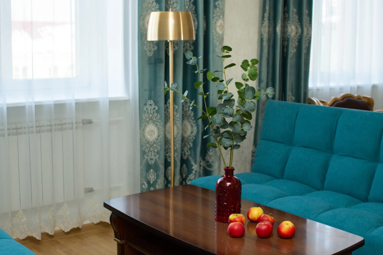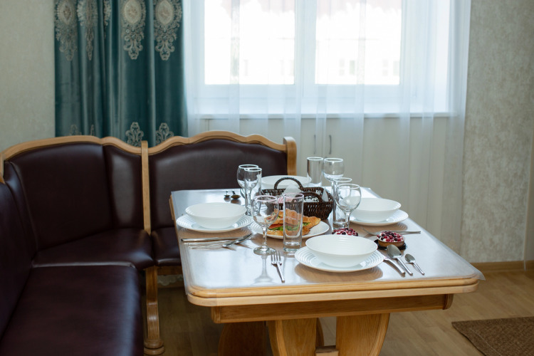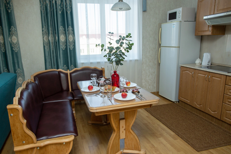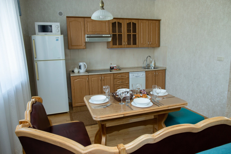 В распоряжении гостей: одна двуспальная и две односпальные кровати, или две двуспальные по запросу, а также два раскладных двуспальных дивана. Апартаменты оснащены постельными принадлежностями и белоснежным бельём. В наличии два телевизора с высокоскоростным безлимитным интернетом, холодильник, плита, посудомоечная машина, микроволновая печь, чайник и стиральная машина. Установлен водонагреватель и дополнительные источники тепла — безопасные конвекторы, что особенно актуально в межсезонье.