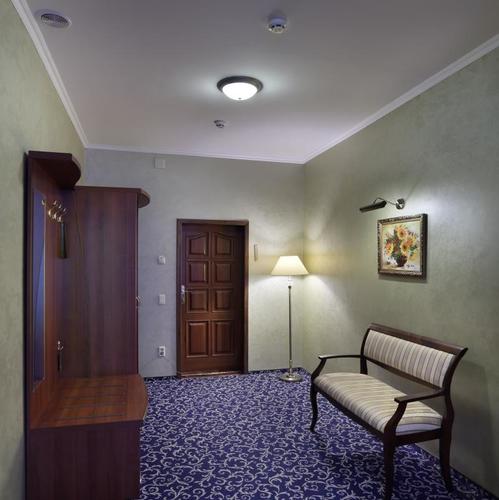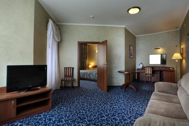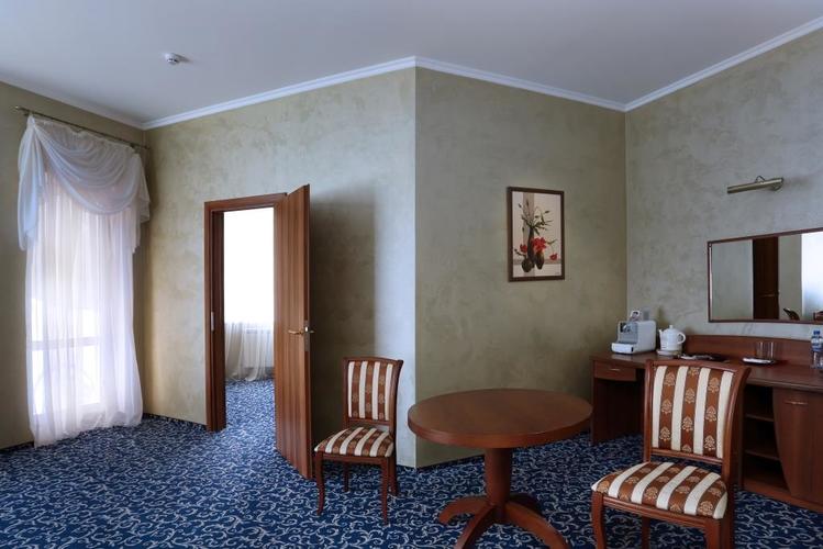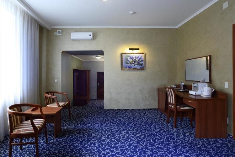 Большой двухкомнатный номер площадью 65 м2 с двуспальной кроватью. Номер для некурящих гостей. Один из трех номеров имеет двухуровневую планировку. Оснащение номера: двуспальная кровать с ортопедическим матрасом, мягкий диван, кресло, прикроватные тумбочки, шкаф для одежды, полка для багажа, журнальный столик, 2 стула, письменный или обеденный стол, индивидуальный сейф, холодильник, lcd телевизор, телефон, кондиционер, WI - FI, электрический чайник, тапочки, халат, набор для ухода за обувью,