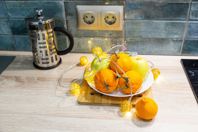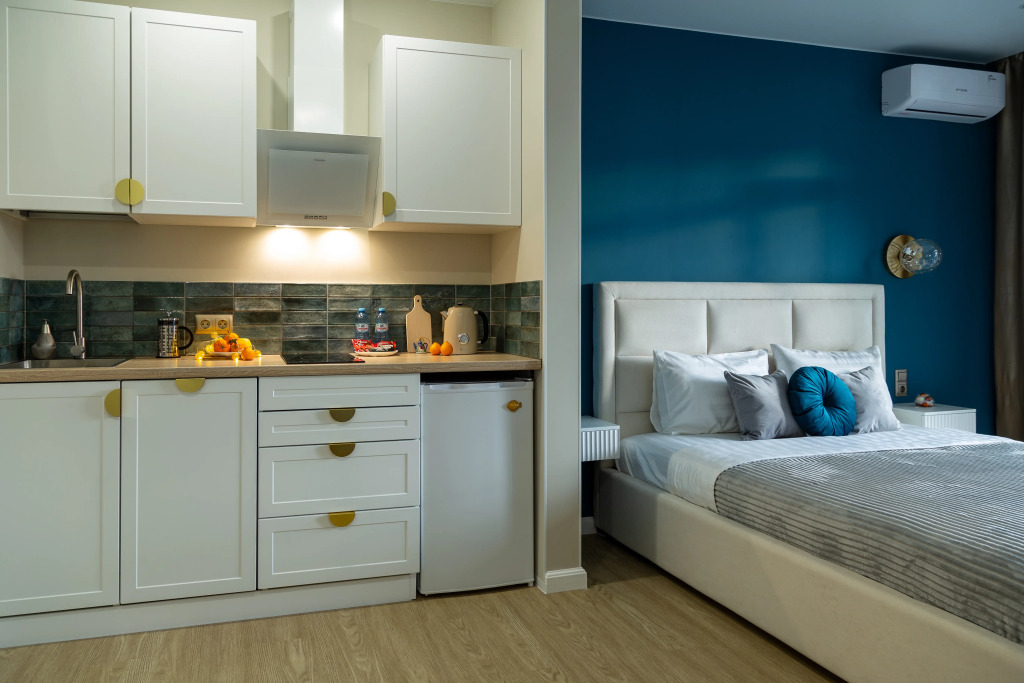 Есть туалетный столик и зеркало с подсветкой. Для гостей предусмотрен раскладывающийся диван с дополнительным спальным местом, компактный холодильник, варочная индукционная поверхность, набор кастрюль, сковородка.