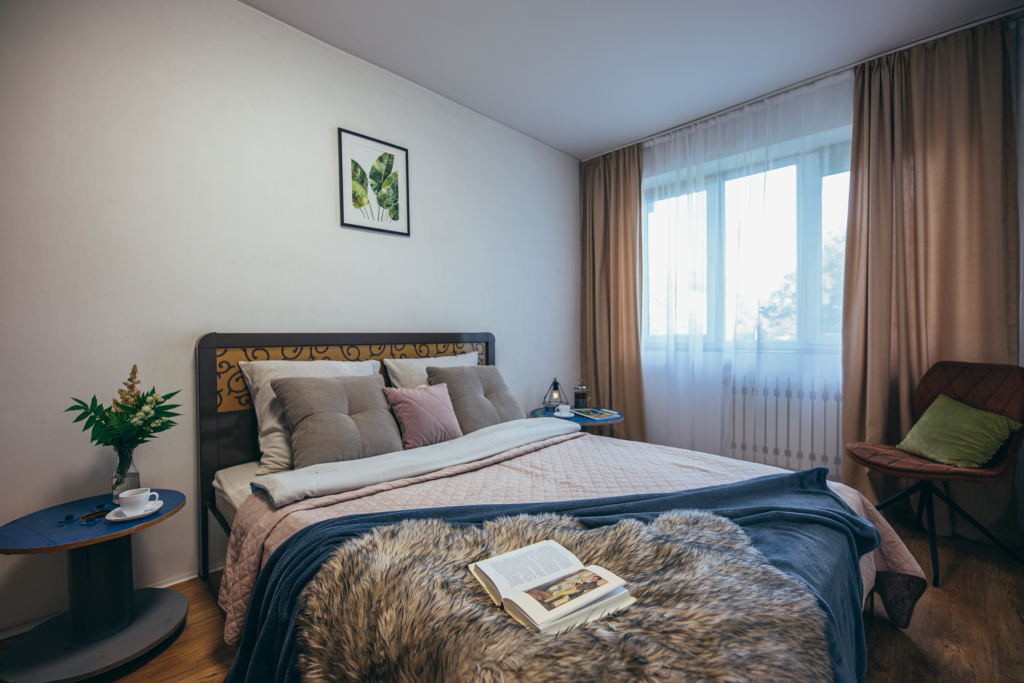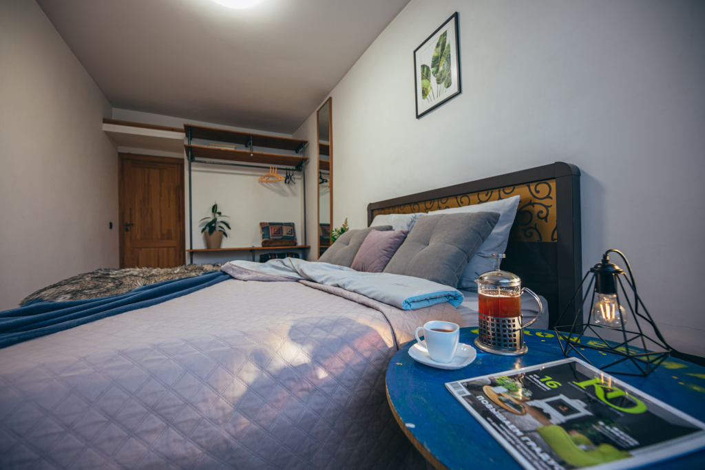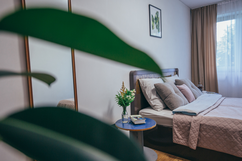 В апартаментах 2 комнаты: спальня с двуспальной кроватью и кухня-гостиная с раскладным диваном. Есть необходимое для комфортного проживания: посуда, техника, постельное белье, Wi-Fi, тропический душ.