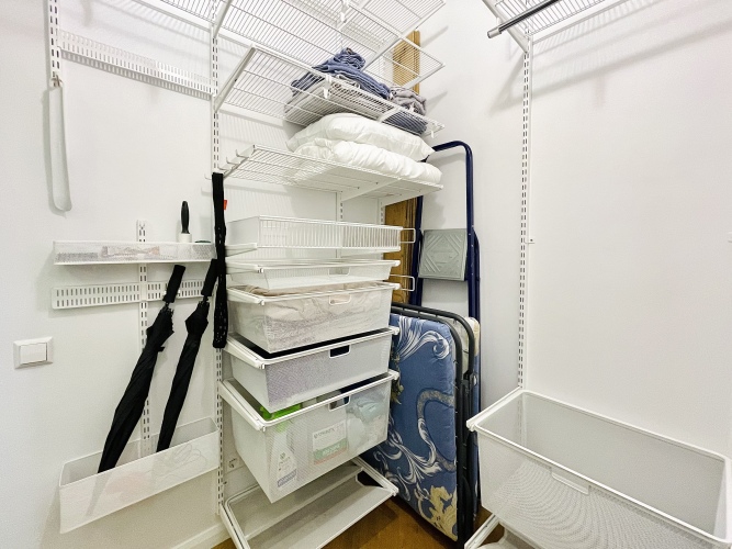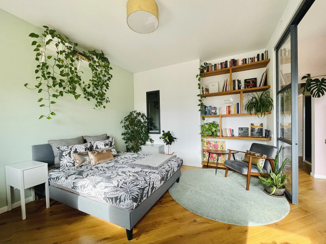В апартаментах есть отдельная гардеробная комната, много растений, натуральный паркет и домашняя библиотека. Вид из окна открывается на портовые краны и немецкий элеватор.
