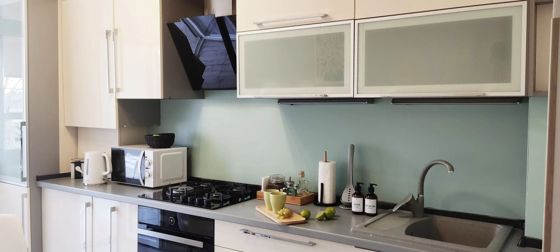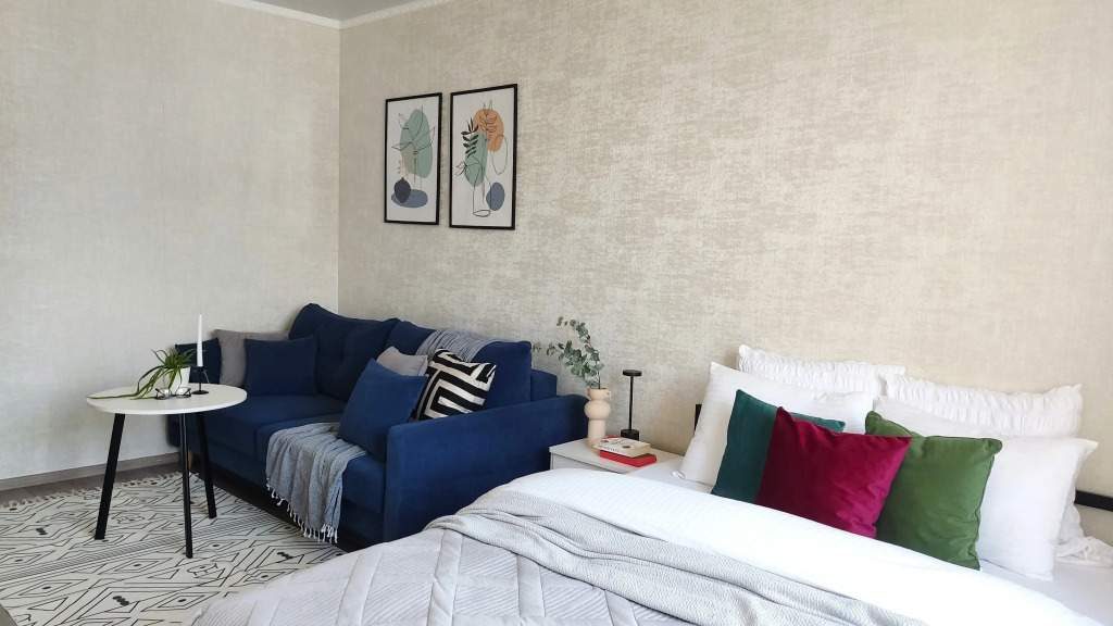 В апартаментах имеются: двуспальная кровать и диван, фильтр питьевой воды, стиральная машина, сушилка, фен, утюг, гладильная доска. По запросу предоставляется кроватка-манеж, горшок, подставка для ног в ванную и детские игрушки.