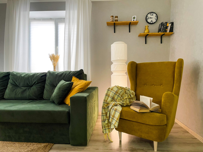 В гостиной имеется раскладной диван, ТВ с кабельными каналами, функцией Smart TV, обеденный стол и стулья, кресло, библиотека, просторный шкаф для хранения вещей, кондиционер. Работает бесплатный Wi-Fi, для гостей подготовлены настольные игры, книги, игрушки для маленьких гостей.