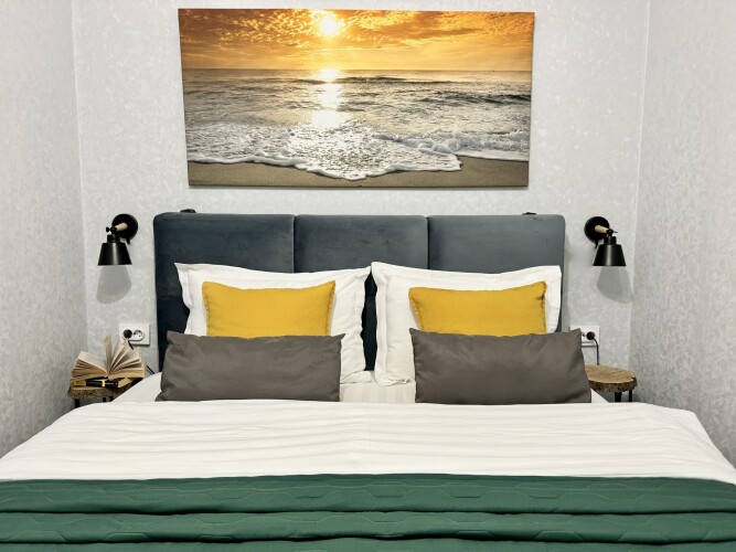 Спальня оснащена двуспальной кроватью с прикроватными тумбами и светильниками, шторами блэк-аут.