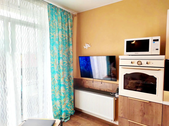 В квартире есть: кухня-гостиная с балконом, комната для отдыха, санузел с окном. Кухня оборудована мебелью, газовой плитой, мультиваркой, духовым шкафом, печью СВЧ, холодильником, другой техникой и посудой. Зона гостиной имеет панорамное окно с выходом на балкон, раскладной диван со столиком и стойкой, телевизор. В комнате есть кровать с матрасом, телевизор SONY, стеллажи и шкаф для одежды. Также есть санузел с душем, с окном, оборудованный стиральной машиной. Гостям предоставляются: постельное бельё, полотенца, средства гигиены. Предоставляются в пользование домашние халаты и тапочки.