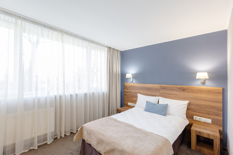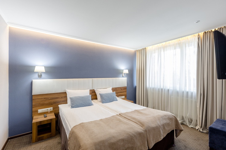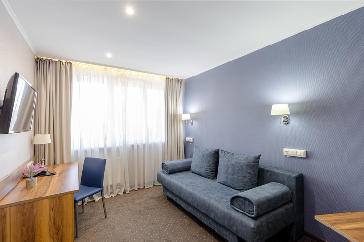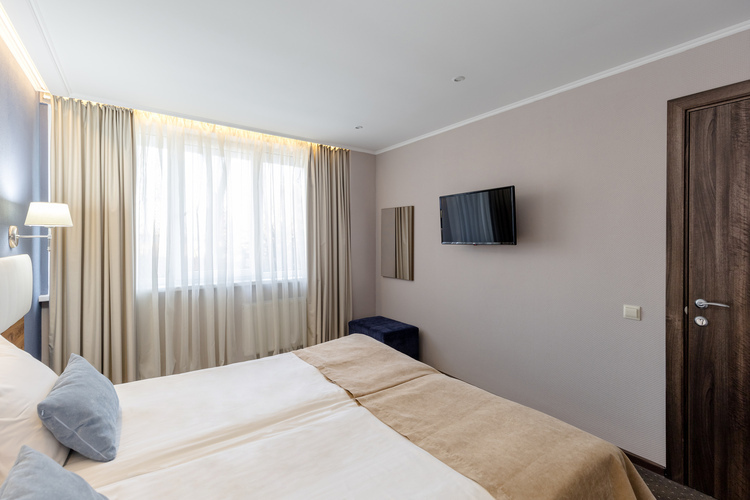 Однокомнатный двухместный номер 1 категории общей площадью 34 кв. м. идеально подойдет для отдыха двух человек или же семьи с ребенком (имеется диван, который можно использовать как дополнительно место за дополнительную плату). В номере находятся две односпальные или одна общая двуспальная кровать, телевизор, просторный шкаф-гардероб, холодильник, телефон для связи с рецепцией, собственная ванная комната с душем (также в ванной комнате имеется фен, увеличительное косметическое зеркало, полотенце