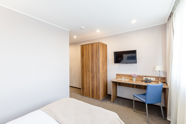 Однокомнатный одноместный номер 1 категории общей площадью 22 кв. м. прекрасно подойдет для размещения одного человека. В номере имеется удобная односпальная кровать, телевизор, просторный шкаф-гардероб, холодильник, телефон для связи с рецепцией, собственная ванная комната с душем (также в ванной комнате имеется фен, увеличительное косметическое зеркало, полотенцесушитель).