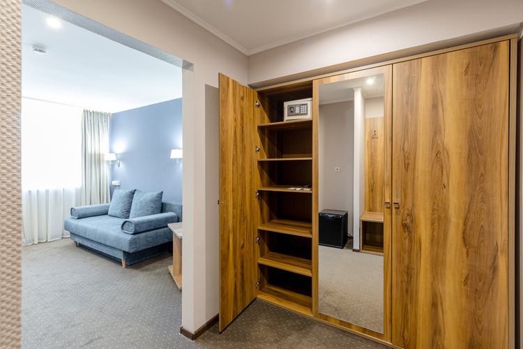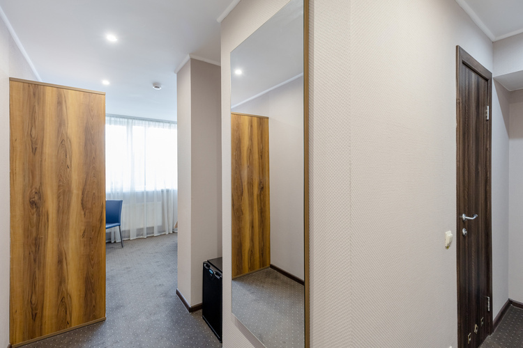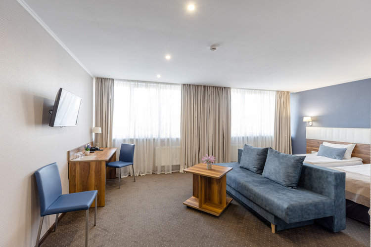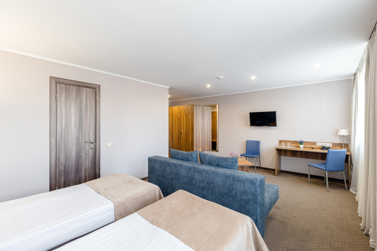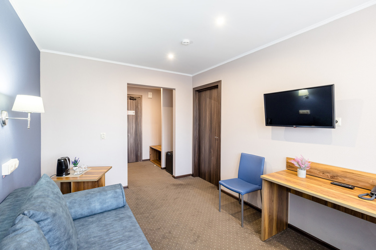Двухкомнатный двухместный номер общей площадью 34 кв. м. с собственной ванной комнатой. В номере имеется спальня, а также гостиная комната, где расположен диван и письменный стол. В номере также находятся журнальный столик, шкаф-гардероб, холодильник, чайник, два телевизора (один в гостиной, другой в спальне), телефон для связи с рецепцией, собственная ванная комната с душем (в ванной комнате имеется фен, увеличительное косметическое зеркало, полотенцесушитель).
