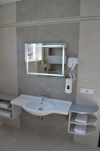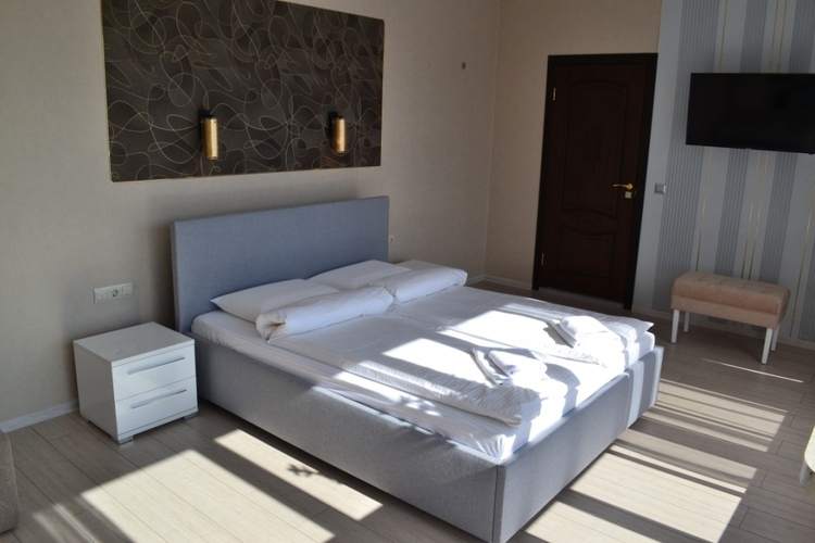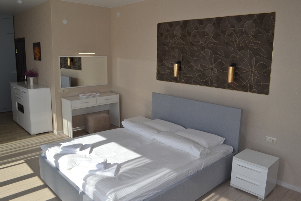 Просторный номер площадью 40 м2, для проживания одного/двух Гостей. В гостиничном номере есть всё необходимое: двуспальная кровать, телевизор с цифровыми каналами, кондиционер, шкафы для одежды и багажа, зеркала, туалетный столик, комод для личных вещей, холодильник, комплект посуды, душевая кабина с системой «тропический дождь», фен и туалет. Украшением номера являются панорамные окна южной стороны общей площадью более 15 кв.м. с видом на парковое озеро. Бесплатная охраняемая парковка для авто.