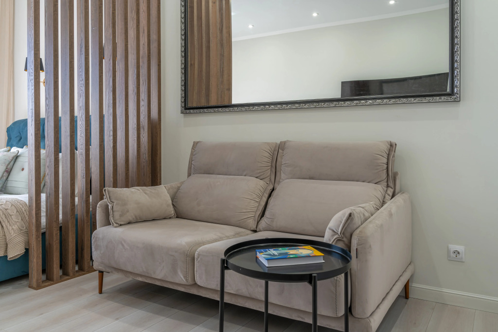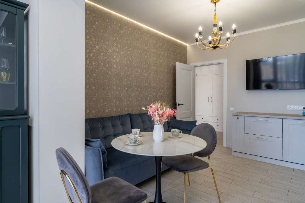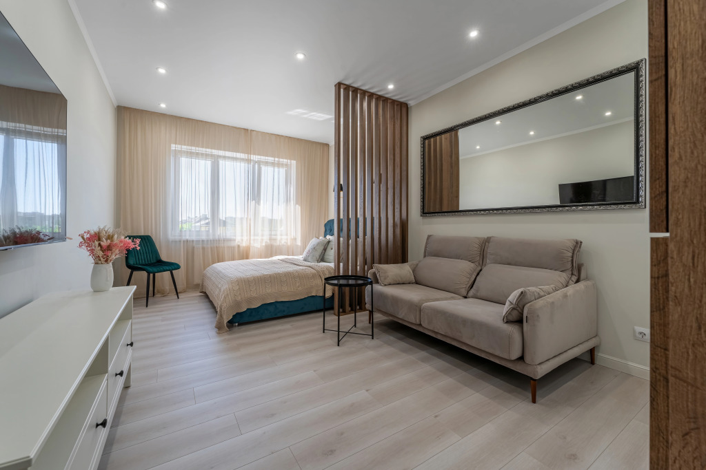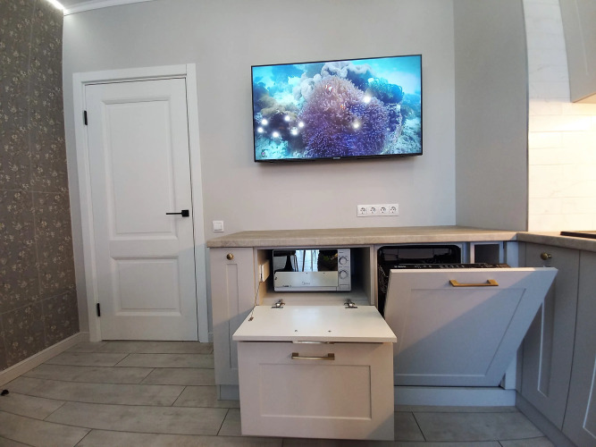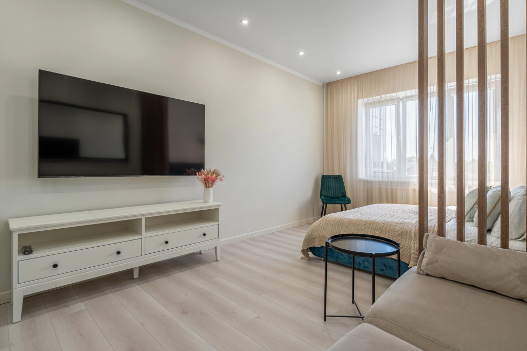 Для удобства гостей предлагается бесконтактное заселение. В апартаментах: Wi-Fi, умная колонка Алиса, фильтр для питьевой воды с обратным осмосом, посудомоечная машина, микроволновая печь, стиральная и сушильная машины, фен, гладильная доска с утюгом, тёплые полы на кухне, коридоре и санузле, 2 телевизора, 1 двуспальная кровать 160 cм, диван 160 см с матрасом-топером для сглаживания неровностей дивана, чай, сахар, гель для душа, шампунь и кондиционер, швейные принадлежности, зонты.