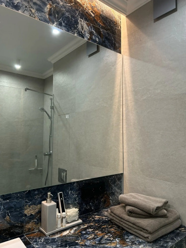 В распоряжении гостей квартира в доме бизнес-класса, площадью 45 кв. м, после уборки горничной, постель и полотенца стираются в прачечной. В квартире могут разместиться 4 гостя. Окна выходят во двор. Функциональной планировкой предусмотрено: площадь кухни-столовой 20 кв. м, спальная комната 15 кв. м, ванная комната и отдельная гардеробная. Гостям доступны: световое зонирование, блекаут-шторы, полы с подогревом, гигиенические принадлежности, тапочки, утюг с доской, фен, зонтик, Wi-Fi и 2 телевизора со Smаrt-ТV, фильтр для питьевой воды, посудомоечная и стиральная машины, кондиционер, раскладной диван в кухне-гостиной. Автономное отопление: температуру батарей и тёплого пола гости могут настраивать по своему желанию.